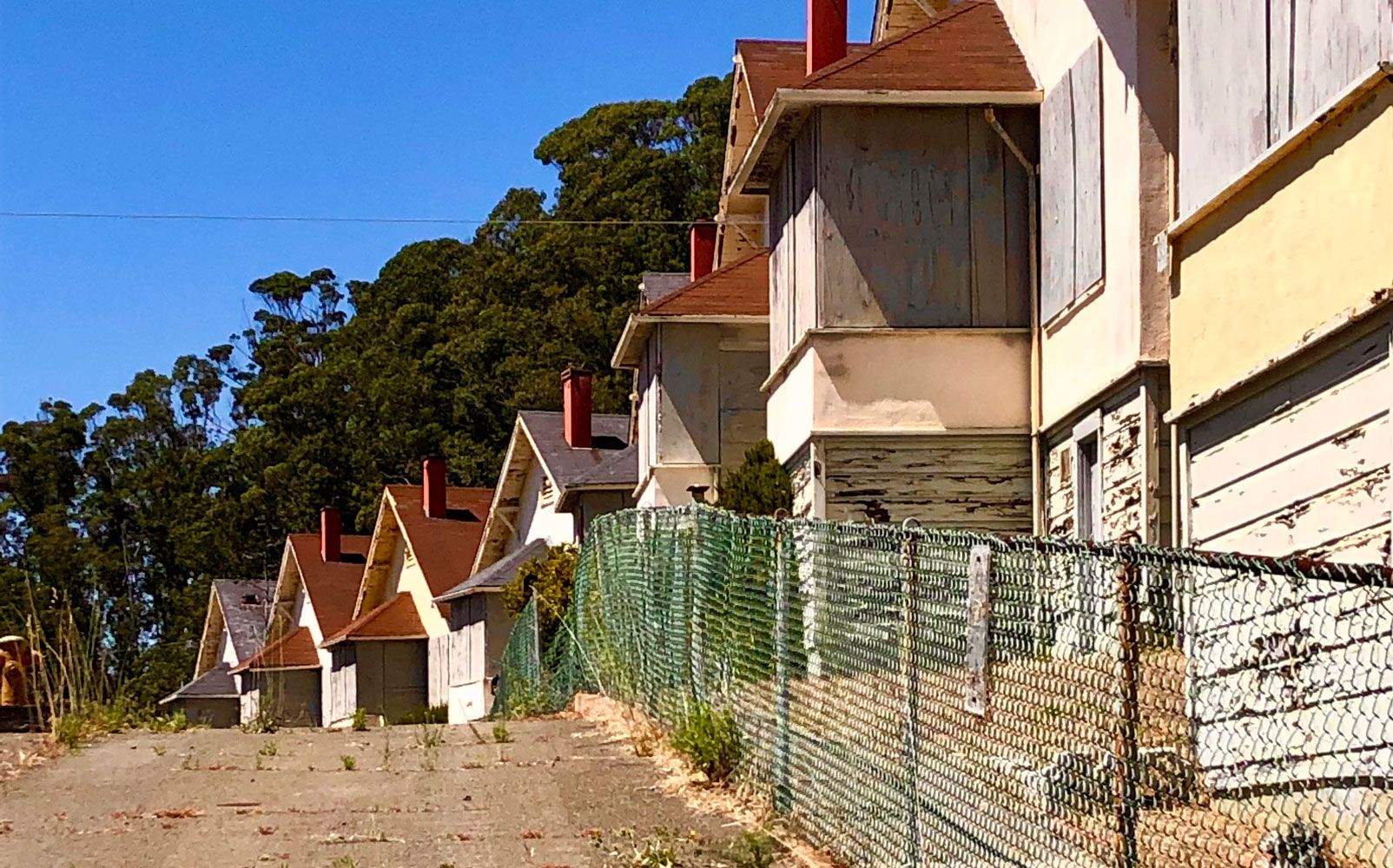 The cottages, built to house winery workers at what was once the world’s largest winery, are located in a National Register historic district. Built between 1907 and 1919, they later housed military families when the Navy acquired Point Molate for a fuel depot during World War II. The base closed in 1995 under the U.S. Department of Defense Base Realignment and Closure Act. Ownership was transferred to the city in 2003.