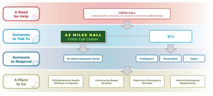 If you or someone you know is experiencing a behavioral health crisis, call the A3 Miles Hall Crisis Call Center at 844-844-5544. Learn more at cchealth.org/a3 or watch a video about the program.