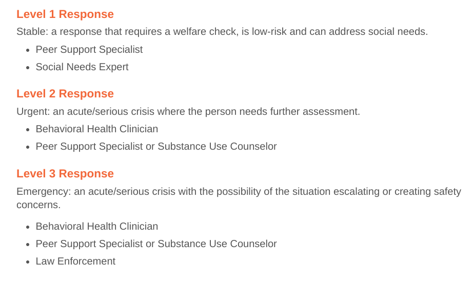 As calls come into the center, trained staff provide support and triage and determine when an in-person response is necessary. The majority of callers’ needs are resolved via phone. A3 staff will determine the response level that is appropriate for each situation. Mobile teams are dispatched to address the crisis and provide care.