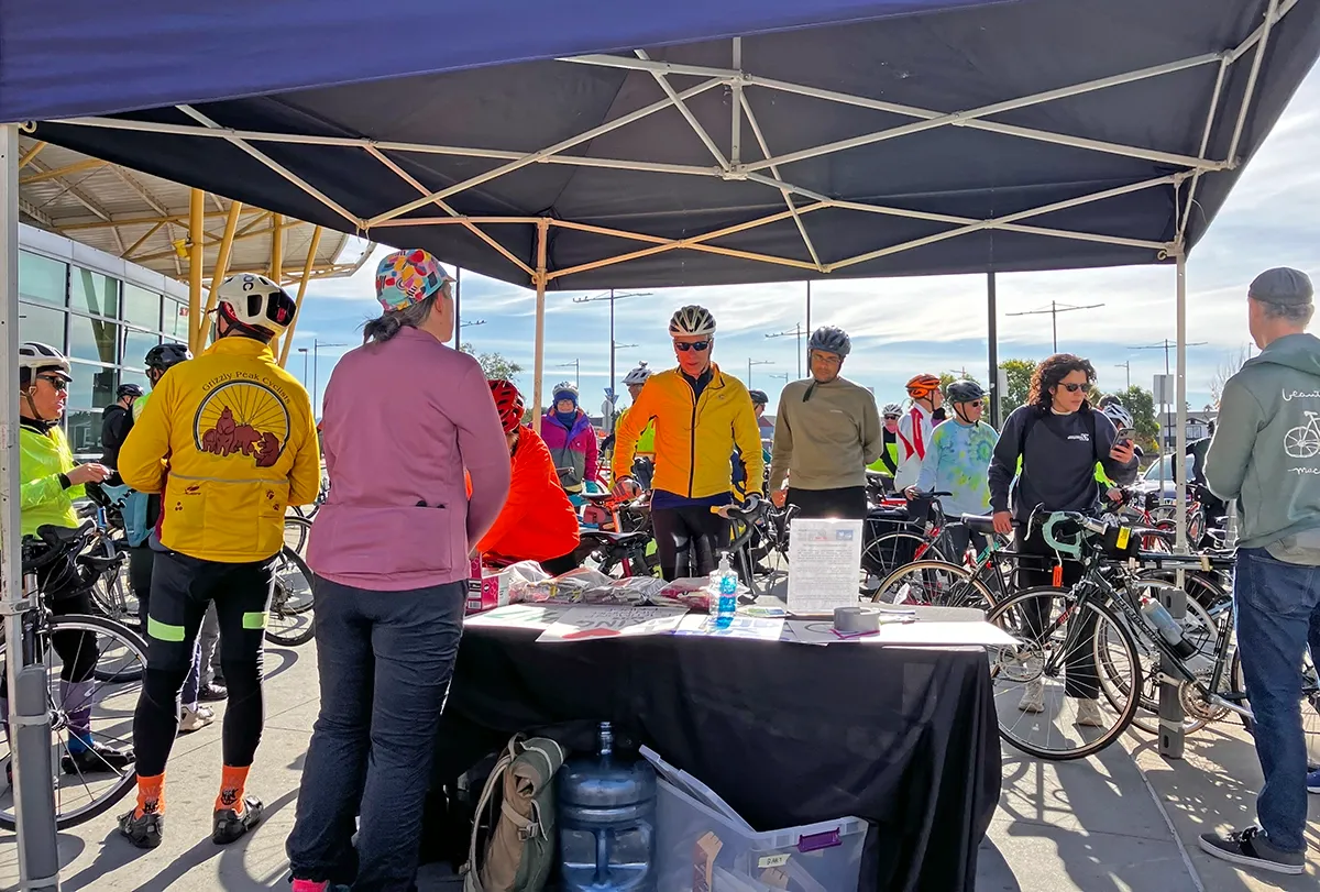 Warren Wells, planning and policy director for the Marin County Bicycle Coalition, handed Marin cycling maps and snacks during the ride’s midway point at Jean & John Starkweather Shoreline Park in San Rafael. Wells said the multi-use path unlocks the ability to ride between the East Bay and Marin County.