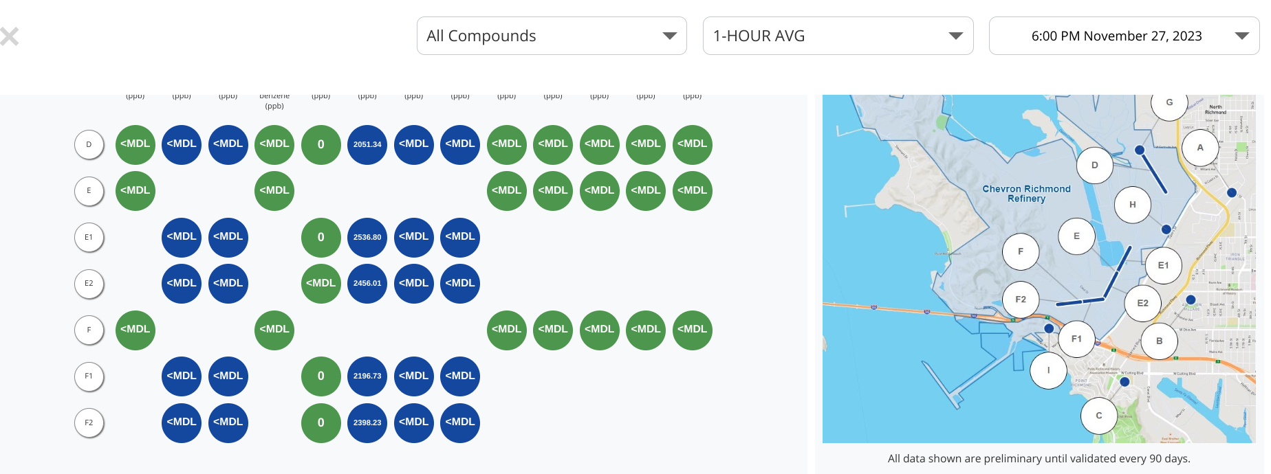 Since 2014, Chevron Richmond has funded an independently operated community air monitoring program designed in partnership with the Richmond community and the City of Richmond. The program collects data from three areas along Chevron Richmond’s fenceline and three neighborhood stations nearby. The air monitoring data is available to the public 24 hours a day.