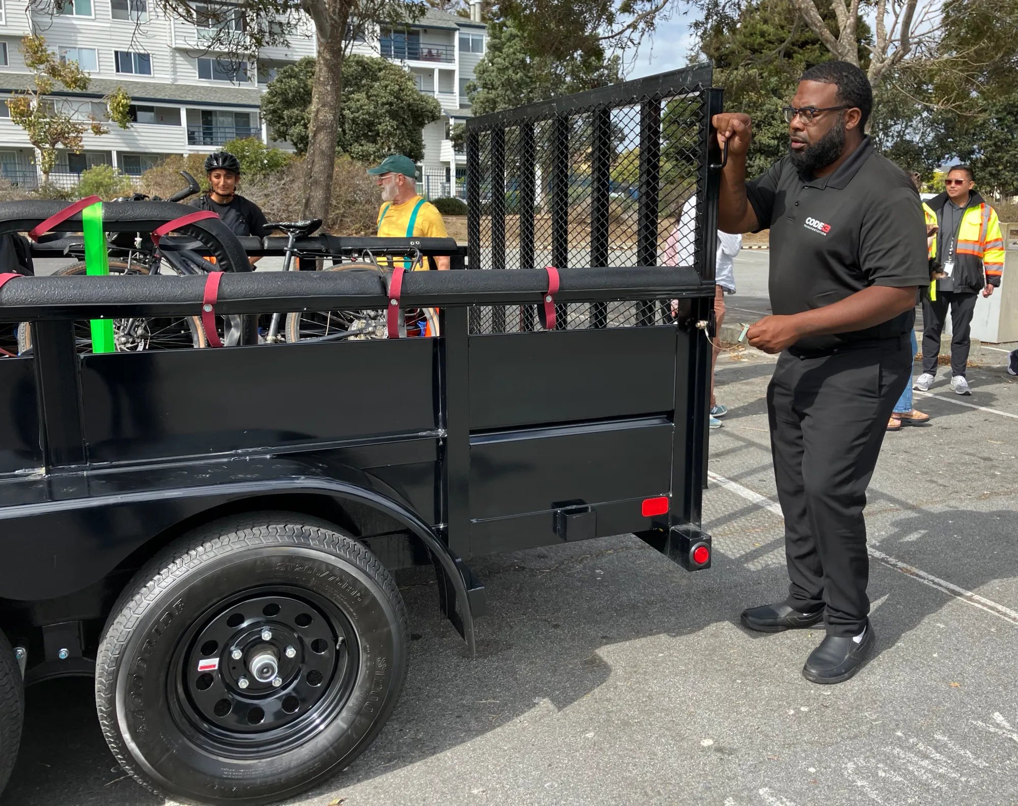 The trailer can accommodate up to 10 standard bikes or e-bikes, with a front hitch that can hold two additional bikes. The demonstration included testing adaptive bikes, including hand-pedaled cycles and three-wheeled bikes used by people with disabilities.