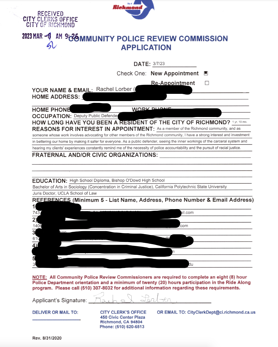Rachel Lorber, an attorney at the Contra Costa County Office of the Public Defender, was appointed by the Richmond City Council to fill an open seat on the Community Police Review Commission.
