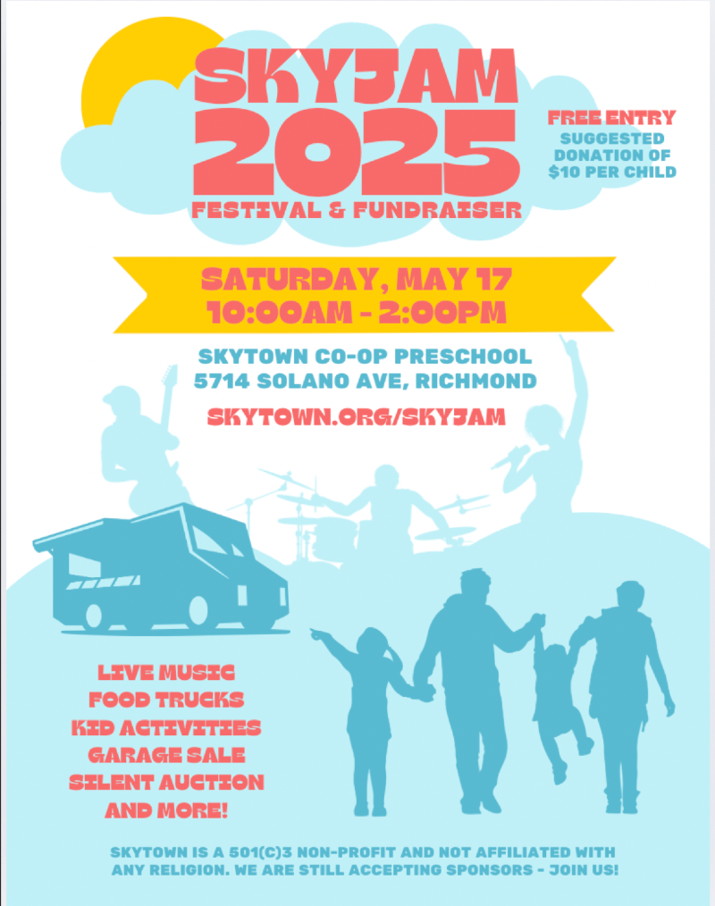 SkyJam Festival & Fundraiser is coming back this year to East Richmond for another jam-packed day of free entertainment, food trucks, and family fun! Come meet the Bay Area's Best Children's Entertainer, Buki the Clown, and enjoy live music and performances by local artists like Hawaiian music ensemble, ‘AHAmele, from Oakland’s Academy of Hawaiian Arts (AHA). Bring your kids and explore engaging activities curated by play-based learning experts and enthusiasts at Skytown Co-Op Preschool. Jump around the festival and stop by the firetruck, bounce houses, and face painting! Also, don’t miss out on great deals and unique offers at the silent auction, garage sale, and free children's book exchange (bring your books with you!).