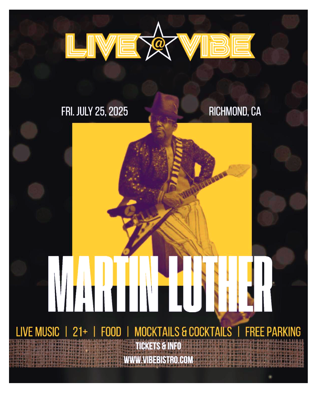LIVE at VIBE is a recurring live music series hosted at Vibe Bistro in Richmond, CA, spotlighting local artists and open-mic jam sessions. Held on Friday evenings, it’s the perfect way to wind down the week with live soul, jazz, blues, and R&B. Upcoming show, the legendary Martin Luther on July 25.
