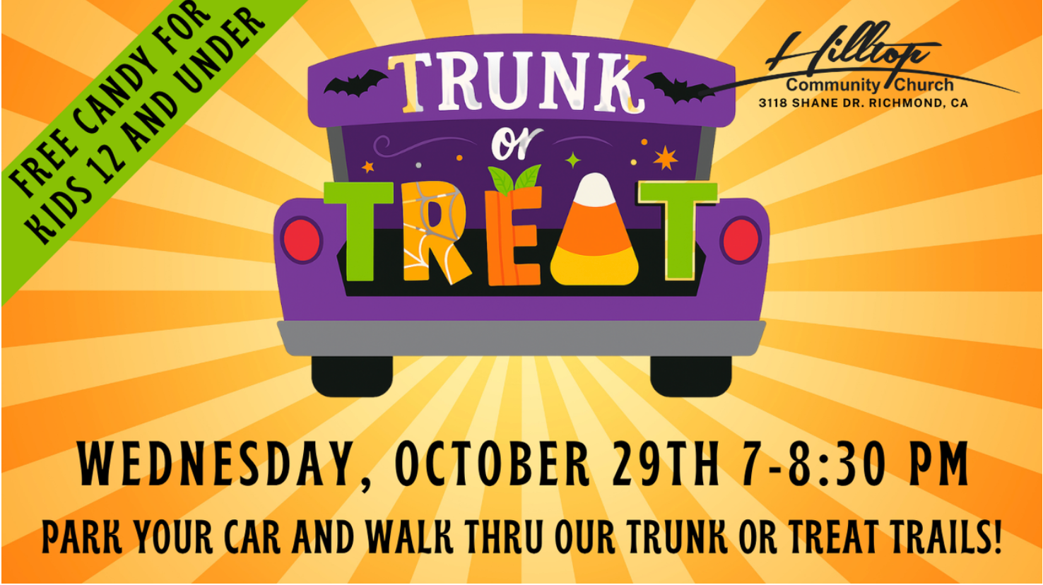 October 29,, 7 - 8:30 p.m. Free candy for kids 12 and under. Hilltop Community Church 3118 Shane Drive, Richmond