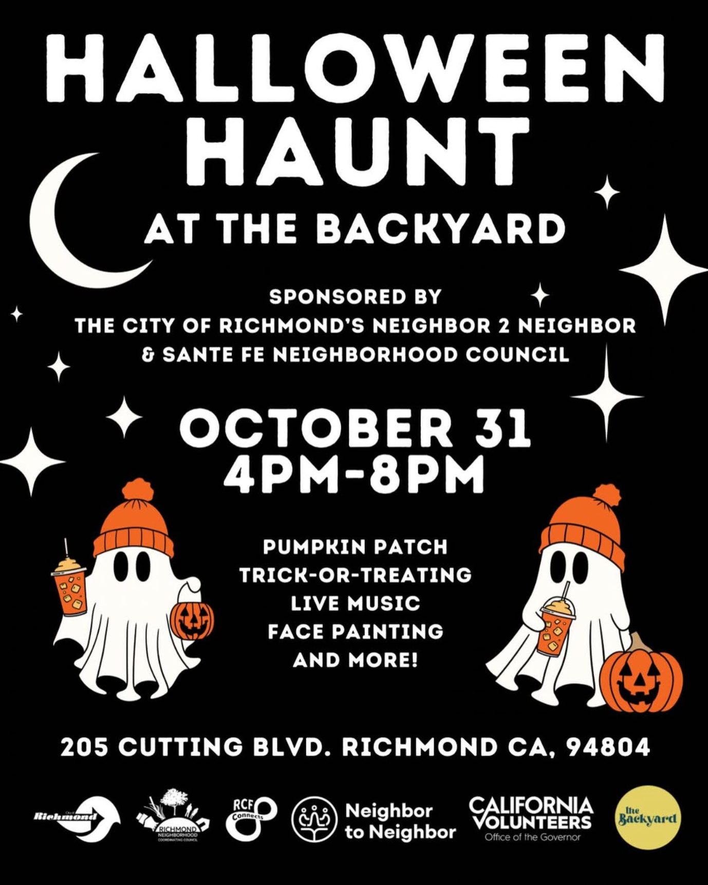 Sponsored by the city of Richmond’s Neighbor to Neighbor and the Santa Fe Neighborhood Council ❤️ Friday, October 31, from 4 p.m.-8 p.m. 🕸️ Also, our 3-year anniversary as a business! 🥰 Enjoy our famous pumpkin patch 🎃 Trick-or-treating 🍬 Live music 🎸 Face painting 🎨 And more! 🎉 We are also DECKING the whole place out in Halloween decor, so please come catch these vibes 😆 Thank you to our amazing city of Richmond for supporting our community here at #RichmondBackyard ❤️