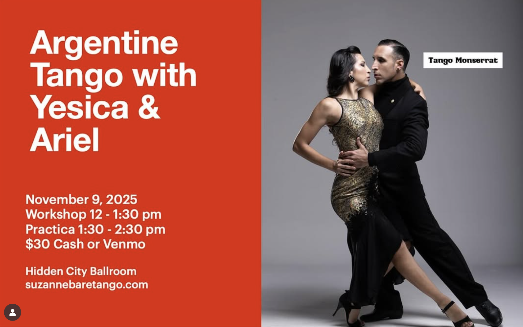 Tango Workshop with Ariel and Yesica $30 includes practica at 2:30