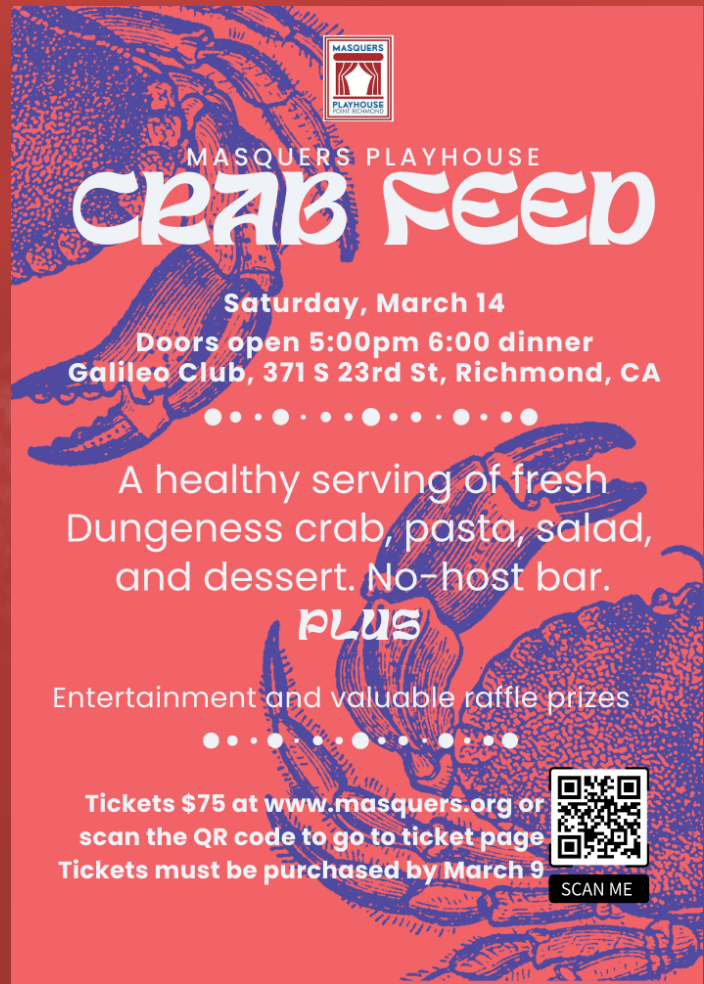The Masquers Playhouse famous Annual Crab Feed tickets are now available. Make sure you get yours soon because this is a sellout event. Held at the Galileo Club in Richmond, the amazing raffle prizes compete with the crab dinner for best of show! Entertainment and drinks fill out a delightful evening for you and your friends and family. Tickets are $75 per person. Doors open at 5 p.m.