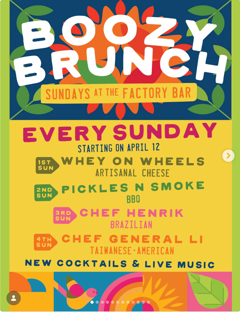 We’re kicking off brunch season at The Factory Bar on April 12—so mark your calendar. This year, we’re doing it big with brunch every Sunday. Each week, one of our favorite chefs will pop up on the patio, serving a unique and delicious brunch menu you won’t want to miss.