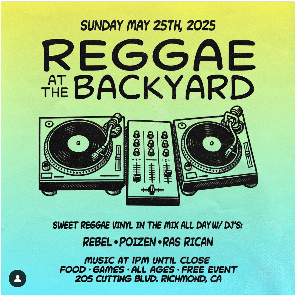 Sunday, May 25, is the last Sunday of the month which means it is REGGAE AT THE BACKYARD time, sweet reggae on vinyl in the mix all day, hosted by @selectarebel w/ special guest dj’s, @djpoizen and @djrasrican, needle drops at 1 p.m.!!! Food and drinks by @richmondbackyard FREE All day reggae party from 1 p.m.-8 p.m. 😎 Come enjoy your favorite #SundayFunday with your favorite Backyard Eats 🍔 #Local beer + wine 🍷 And a beautiful day at your friendly neighborhood Backyard 🌴📍205 Cutting Blvd. Richmond, CA 94804