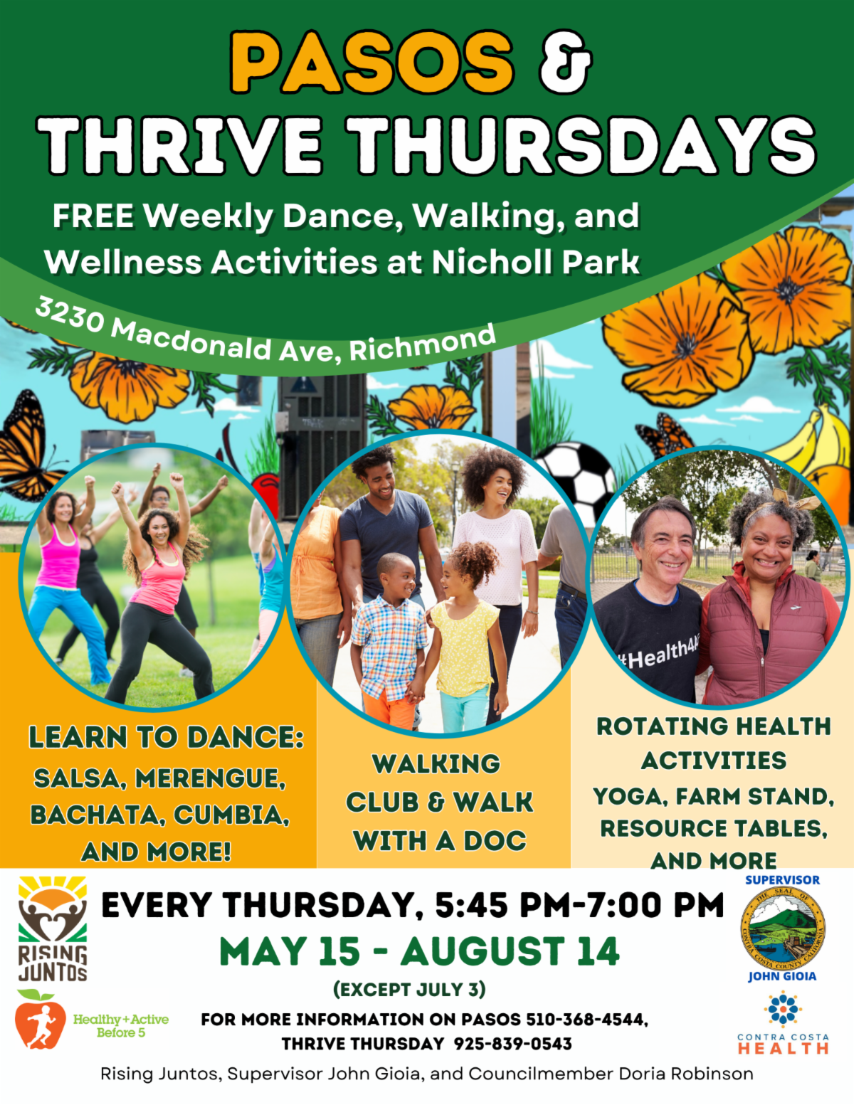 Join Us Every Thursday evening to improve our Health and Wellness. Thrive Thursday/PASOS Health Event at Nicholl Park in Richmond from 5:45-7 p.m.