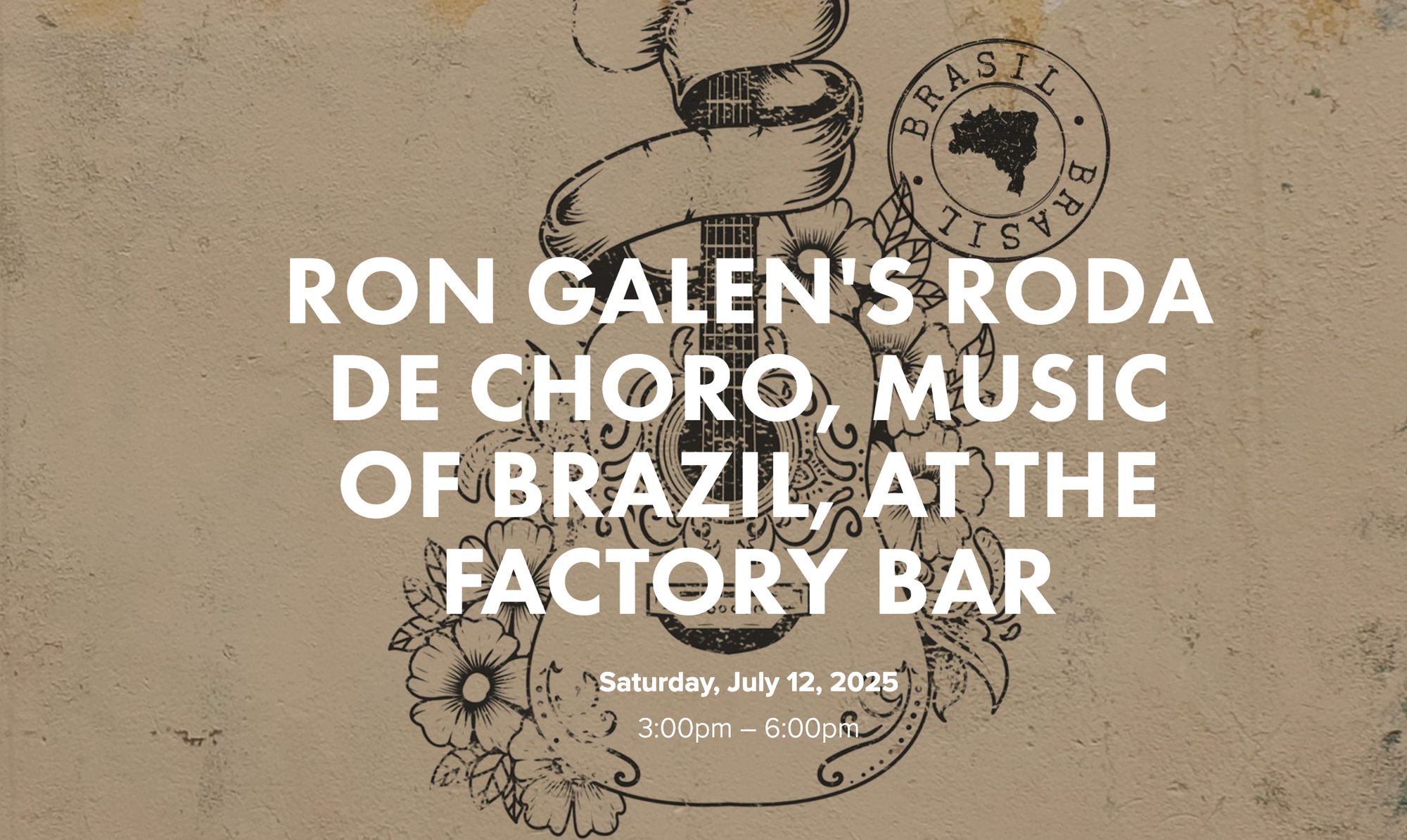 This Saturday in the patio, we are hosting Ron Galen's Roda de Choro, music of Brazil. A roda is a circle of players having a jam session. We'll have players from around the Bay doing music by Pixinguinha, Jacob do Bandolim, Waldyr Azevedo, et al. You can also pick up some Brazilian food from Chef Henrik out front and pop in the patio for some Brazilian choro music. The Factory Bar 12513 San Pablo Avenue Richmond, CA, 94805