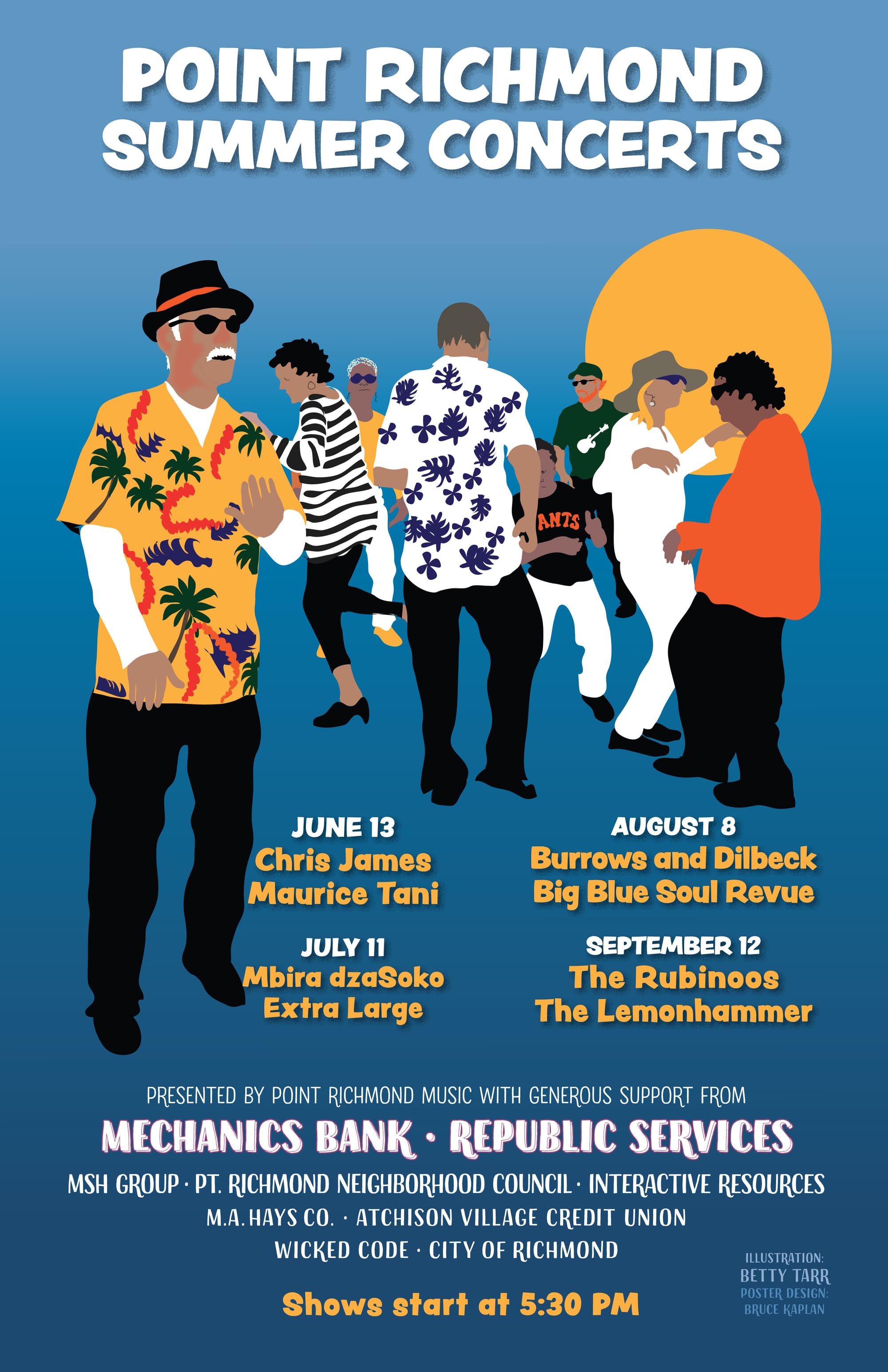 PRM concerts are held every second Friday of the month through September in downtown Point Richmond (Park Place between West Richmond and Washington Avenues) from 5:30 p.m. to 8 p.m.