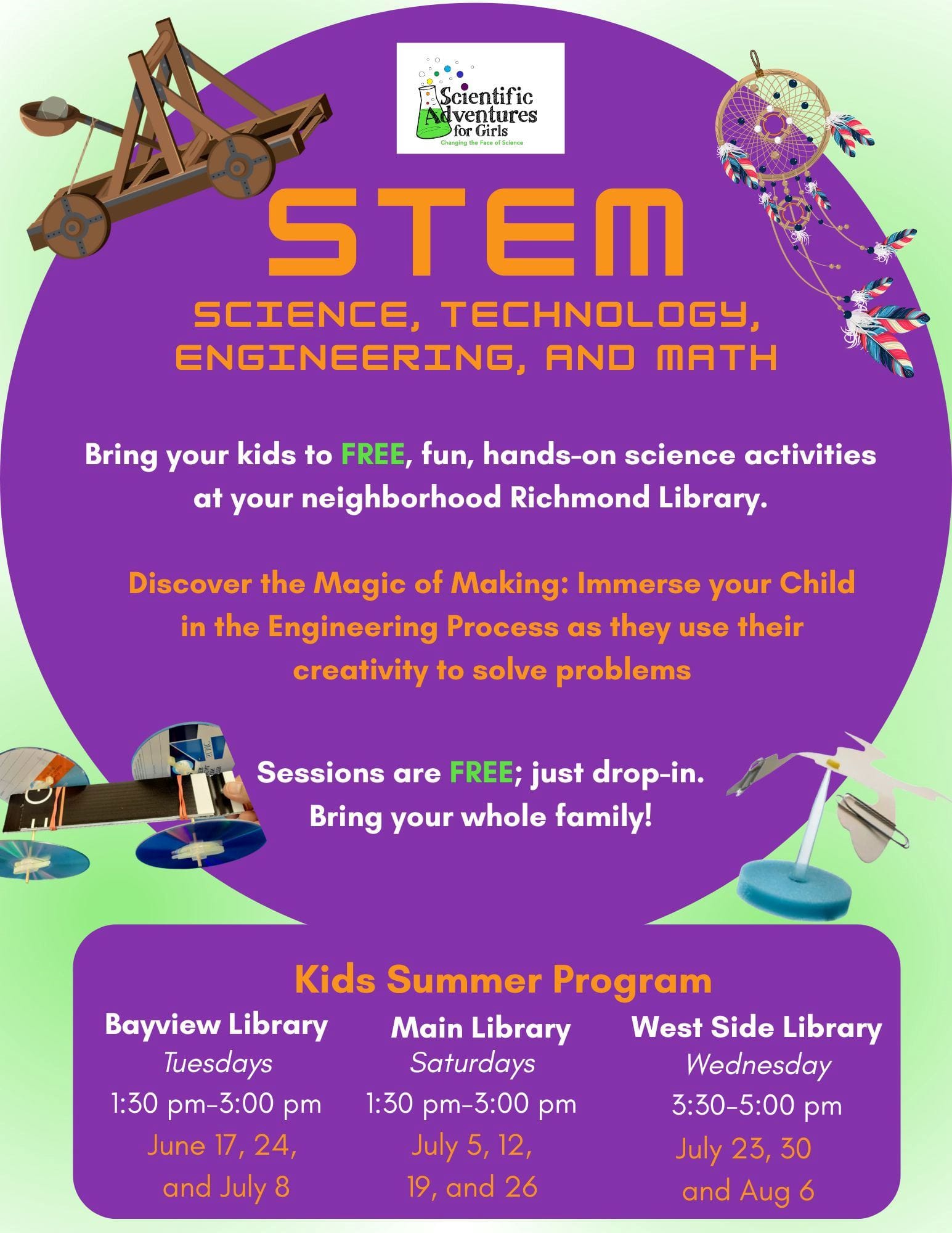 Join us for STEM Library classes with Scientific Adventures! Free, hands-on STEM projects for all kids and their families, so if you have ever wondered what an SAfG class looks like in action, stop by! 1:30 - 3 p.m. Madeline F. Whittlesey Community Room 325 Civic Center Plaza Richmond, CA 94804