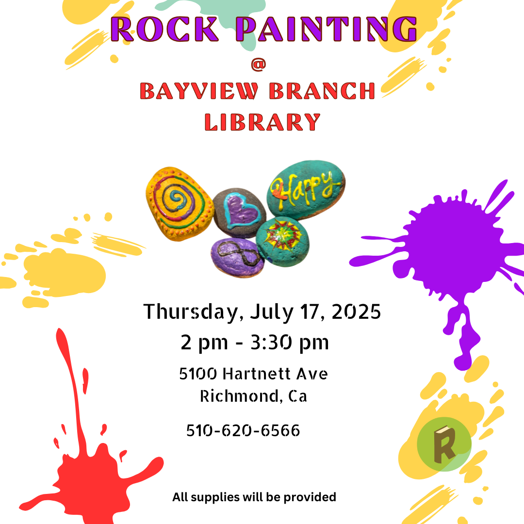 Get creative and join us for a fun and relaxing rock painting session at the Bayview Branch Library! No previous art experience needed—just bring your imagination! This program is FREE and open to all ages. All supplies will be provided, so just bring your creativity and let's paint some rocks!