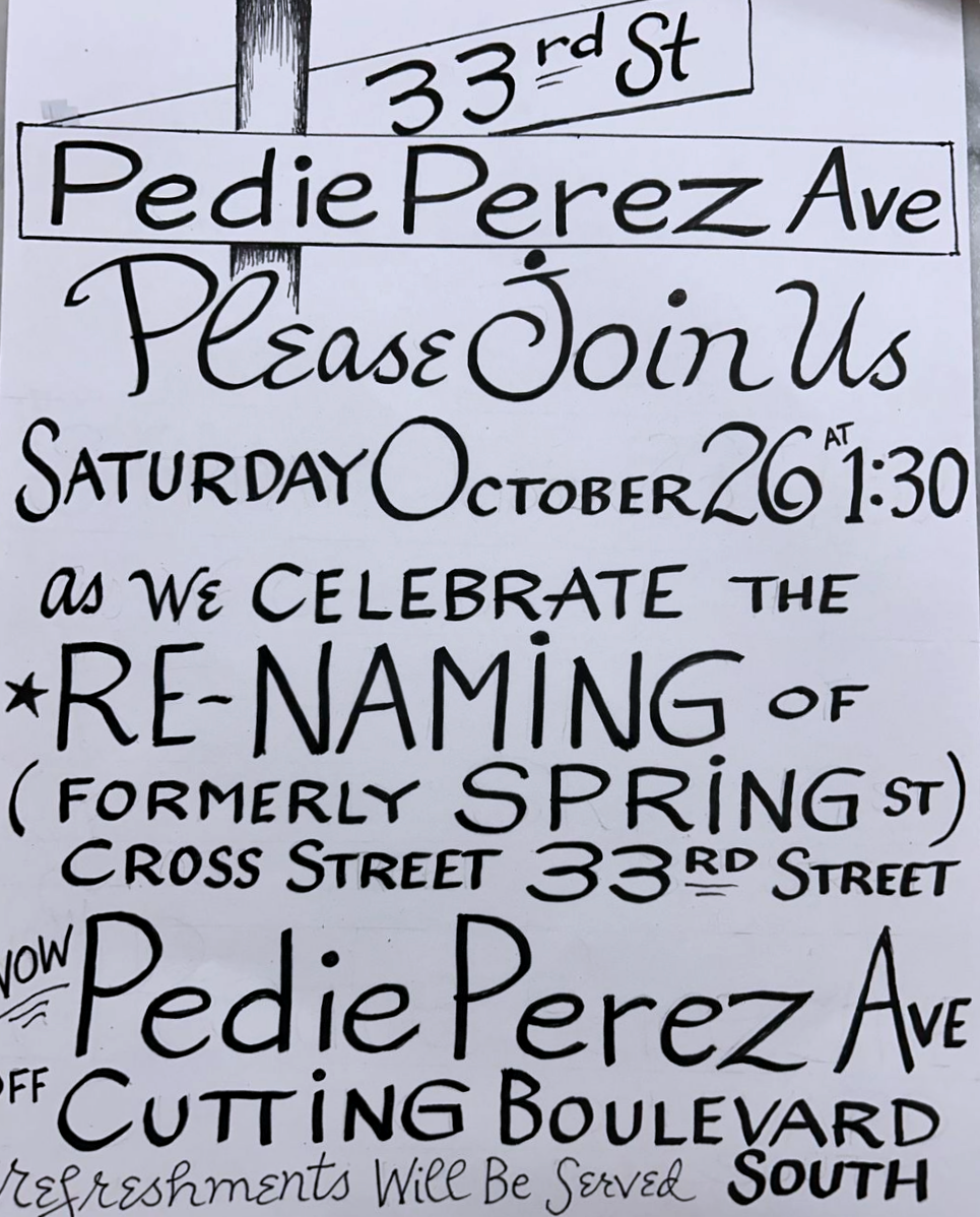 Pedie Perez: Street name change celebration! Saturday, October 26 @ 1:30 p.m.