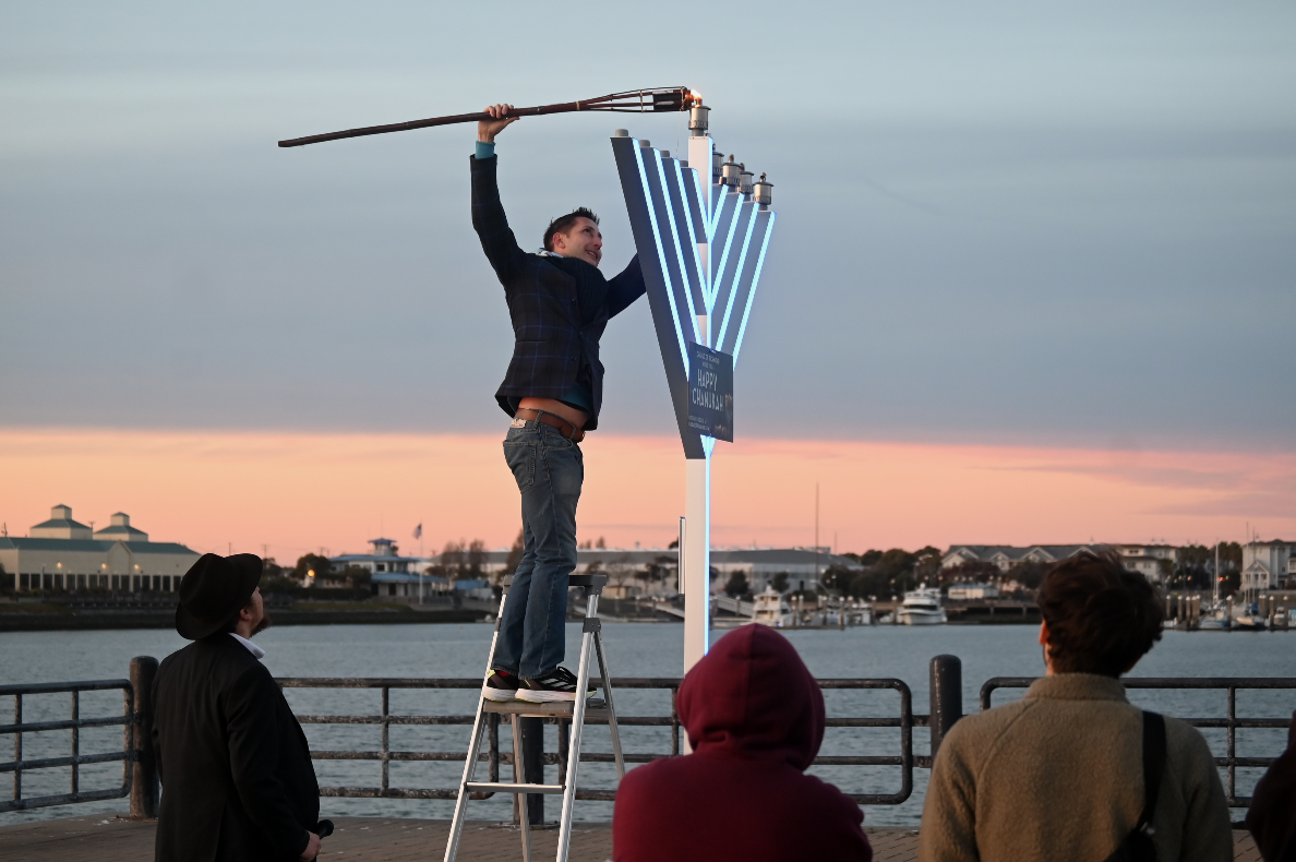 “They decided to go ahead anyway and light the menorah, and miraculously, instead of being lit for one night as it should have, the oil lasted for eight nights,” Wagner said at the waterfront gathering. “Some say imagine if you look at your phone and you have enough battery for one hour, and it lasts for eight.”