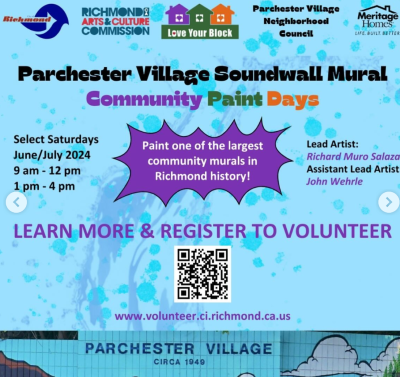 Come join us as we kick off our Parchester Village Soundwall Mural Community Paint Day to paint one of the largest community murals in Richmond's history! Paint days will be June 1st, June 8th, June 15th, July 13th, July 20th & July 27th from 9:00 am to 12:00 p.m. and 1:00 pm to 4:00 p.m. Lunch and snacks will be provided.