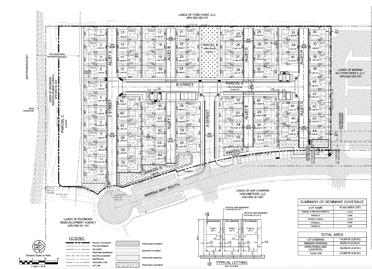 The Marina Point Residential Project calls for 70 three-story homes plus 30 accessory dwelling units on a 4.92-acre vacant parcel next to the Rosie the Riveter Visitor Center, even though it does not meet the city’s density, shoreline, or housing-element requirements.