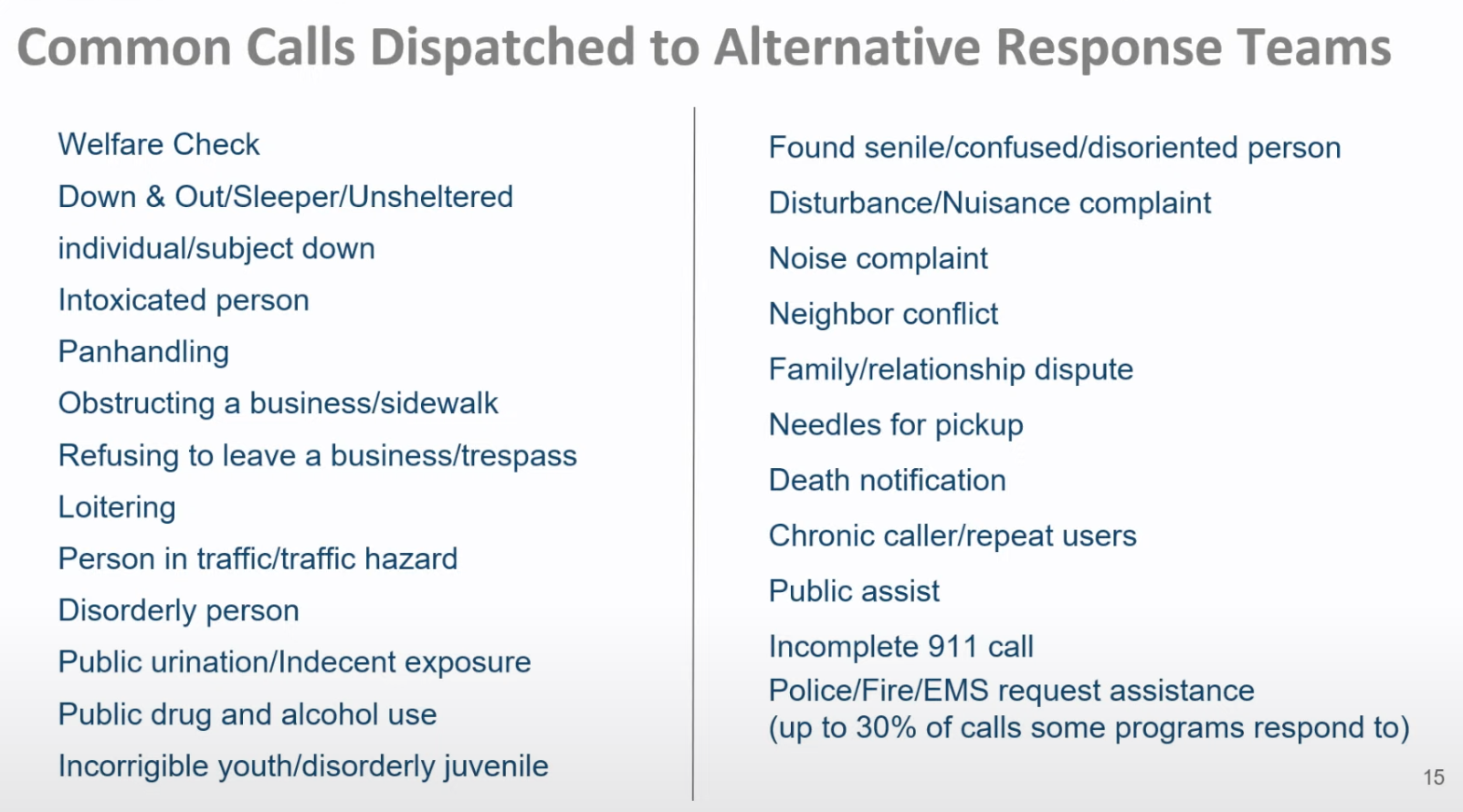 The specific types of calls to be handled by the alternative response program will be developed by CCRP staff, the Richmond Police Department, the Richmond Fire Department, and 911 dispatchers). Situations that are commonly and successfully responded to by such programs include public intoxication, noise complaints, and trespassing.