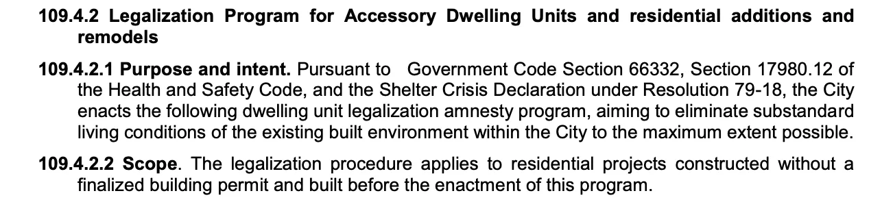 An amnesty program for homeowners with unpermitted accessory dwelling units or residential additions allows property owners to come forward, hire a licensed engineer, and legalize unauthorized construction without facing the city's standard penalty, an investigation fee equal to three times the normal permit cost. The program is tied explicitly to Richmond's housing and homelessness goals.