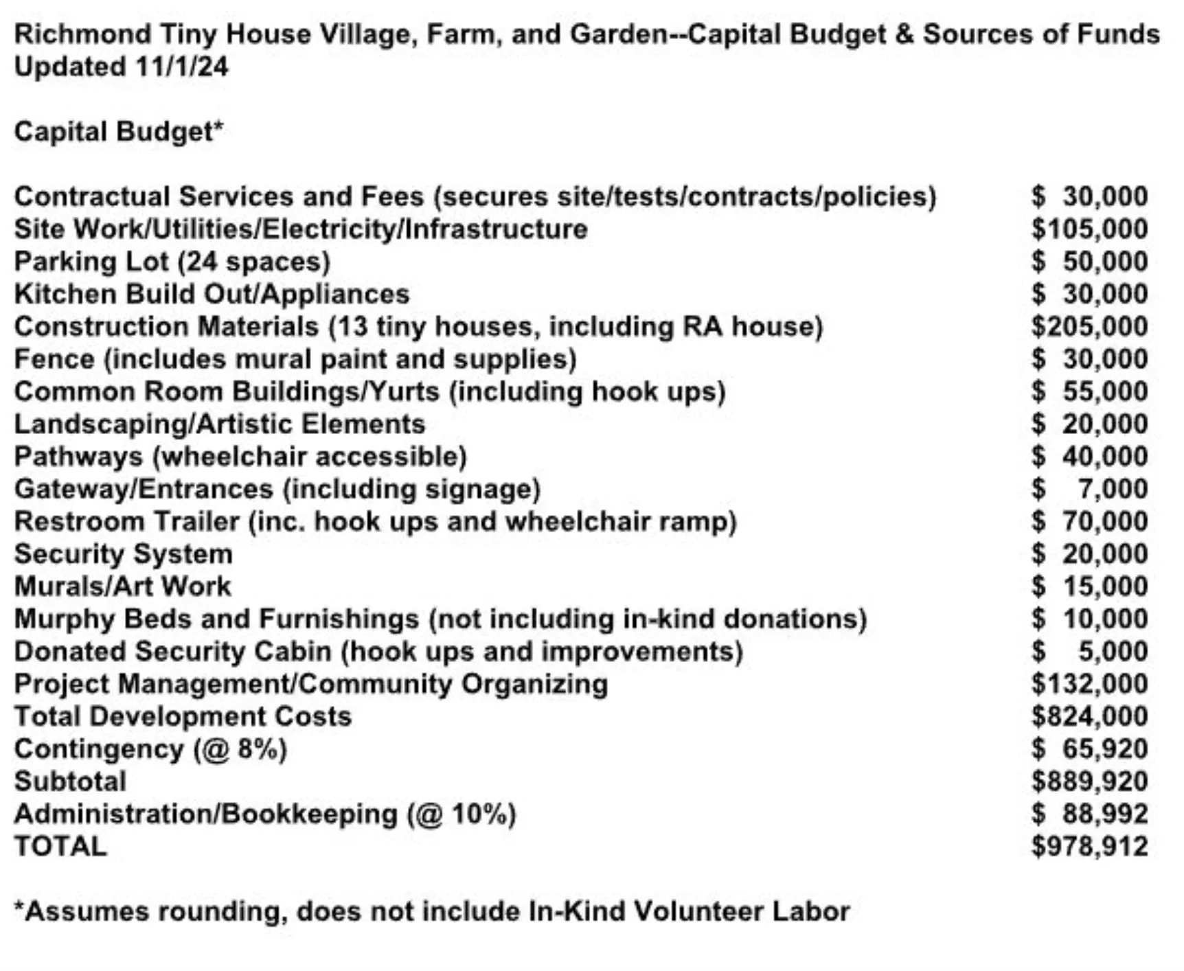 The almost million-dollar capital budget includes $205,000 for construction materials for 13 tiny houses, $105,000 for site work, including utilities and infrastructure, and $132,000 for project management and community organizing. Funds come from a variety of sources, including government funding from Contra Costa Measure X funds and the City of Richmond. Religious organizations have committed $91,000, including $77,000 from the Mormon Church.