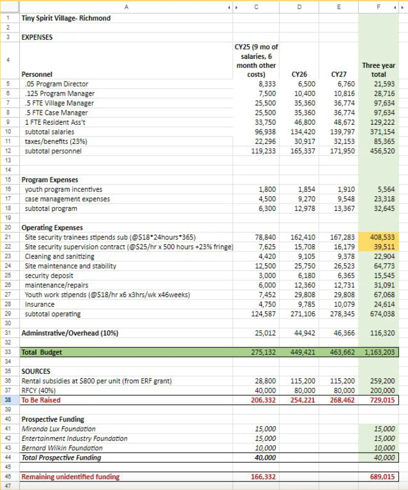 Revenue includes $259,200 in rental subsidies from the Encampment Resolution Funding at $800 per unit. With $729,000 still to be raised.
