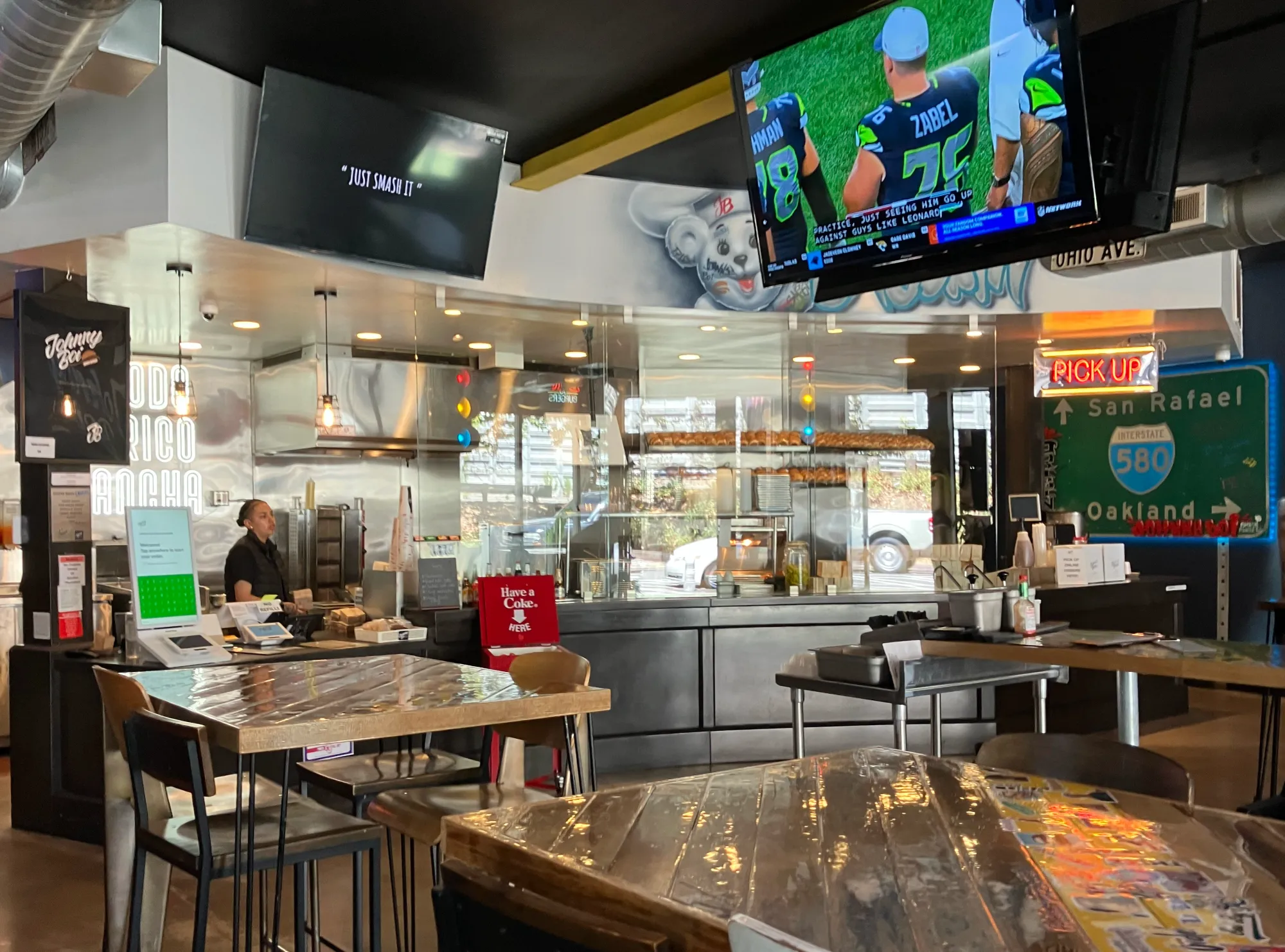 Johnny Boi Smash Burger doesn’t hide what it is. The somewhat new spot in Point Richmond is designed for maximum effect: a clean, mural-bright interior with a neon “Pick Up” sign, polished wood tables plastered with stickers, and TVs tuned to football. Modern heartland country hums in the background while the griddle sizzles.