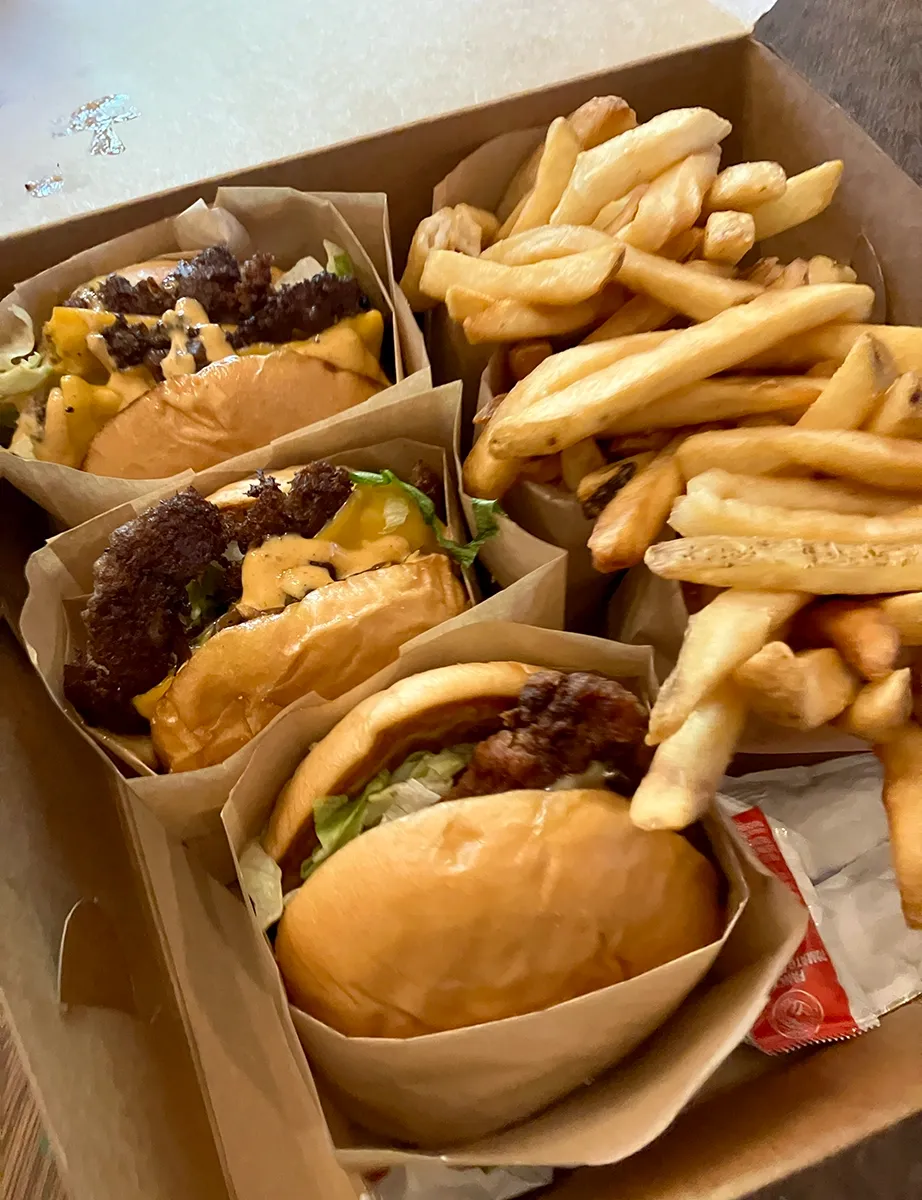 Johnny Boi Smash Burger is located at 201 Tewksbury Avenue in Point Richmond. Three sandwiches and fries cost $47.57.