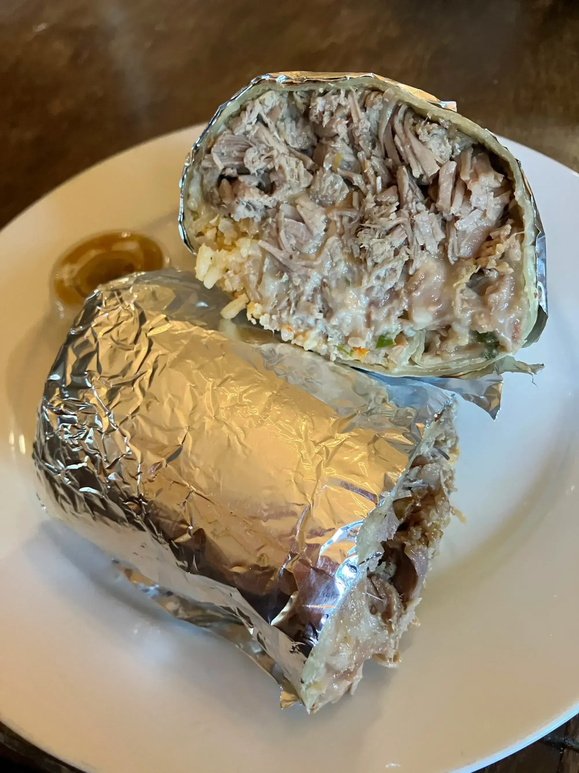 The burrito arrives. 799 grams. Nearly two pounds of burrito, wrapped in foil, toasty from the griddle. The tortilla has char on it, real char from real contact with real heat, not the pale steam-table warmth that passes for tortilla preparation at lesser establishments. The inside has yielded. This is a properly constructed burrito tortilla, and everything flows from that.