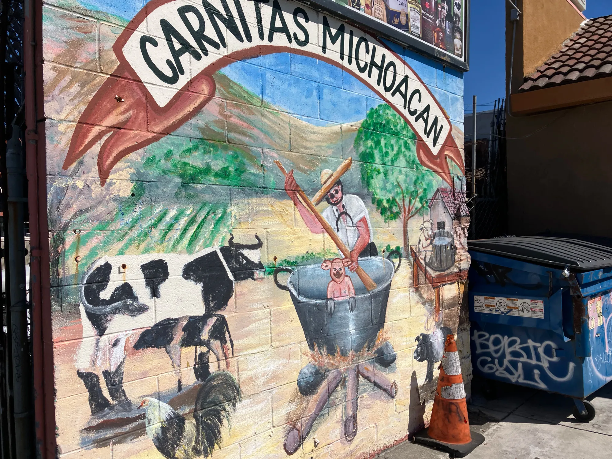 Cazadores Market at 1076 13th Street does not announce itself with fanfare. The mural does the talking: a wall-sized Carnitas Michoacan fever dream painted on cinderblock, a man stirring a vat of pork over open flame. At the same time, a cow watches from the left side of the frame with what can only be described as philosophical resignation. A pig is in the vat. The man is stirring. The cow has processed this information and arrived at a kind of bovine stoicism.