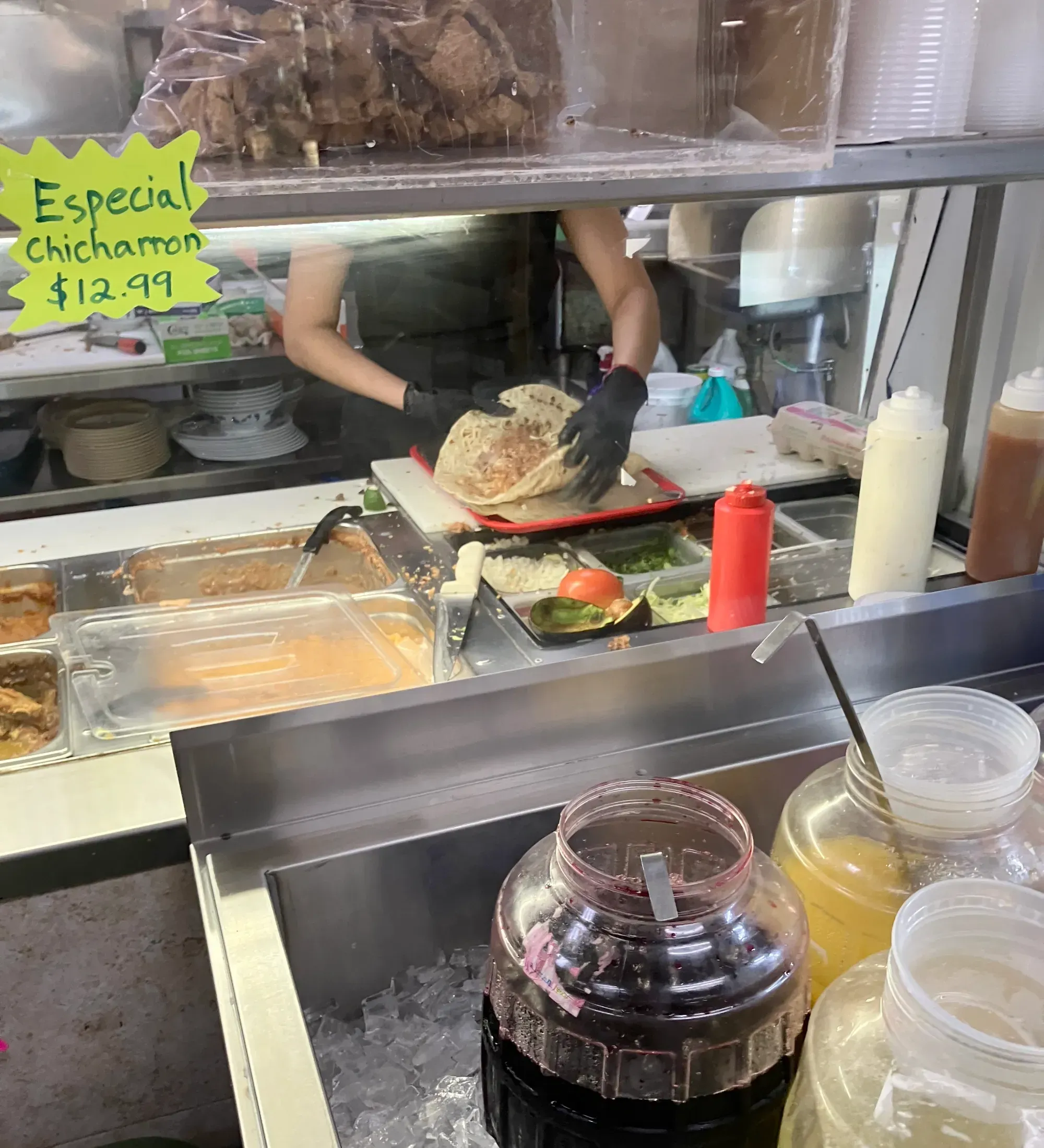 The cooks are working behind the counter in black gloves, assembling lunch on red trays with the focused calm of someone who has done this ten thousand times and who is doing it now with exactly as much ceremony as it requires, which is none. The burrito artist composing our burrito has a flat griddle going. In a display case, we can see products waiting: big cooked chunks of carnitas, fried dark. A lot of people come here for that. We are here for the burrito, and the burrito is coming.