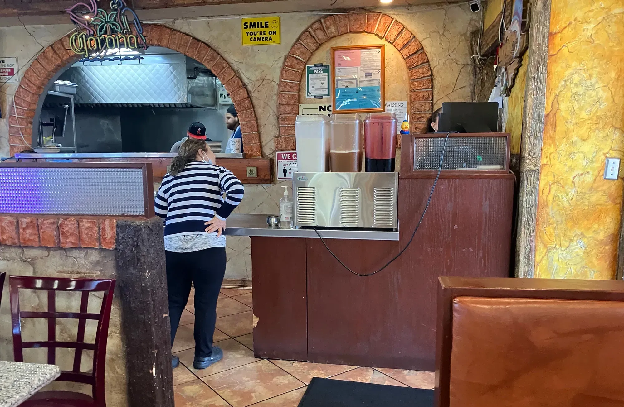Terracotta tile underfoot. Spanish-language news murmurs from a flatscreen mounted up in the corner, Edición Digital, while the afternoon light comes through windows that look directly back out at the fake taco truck you just escaped.