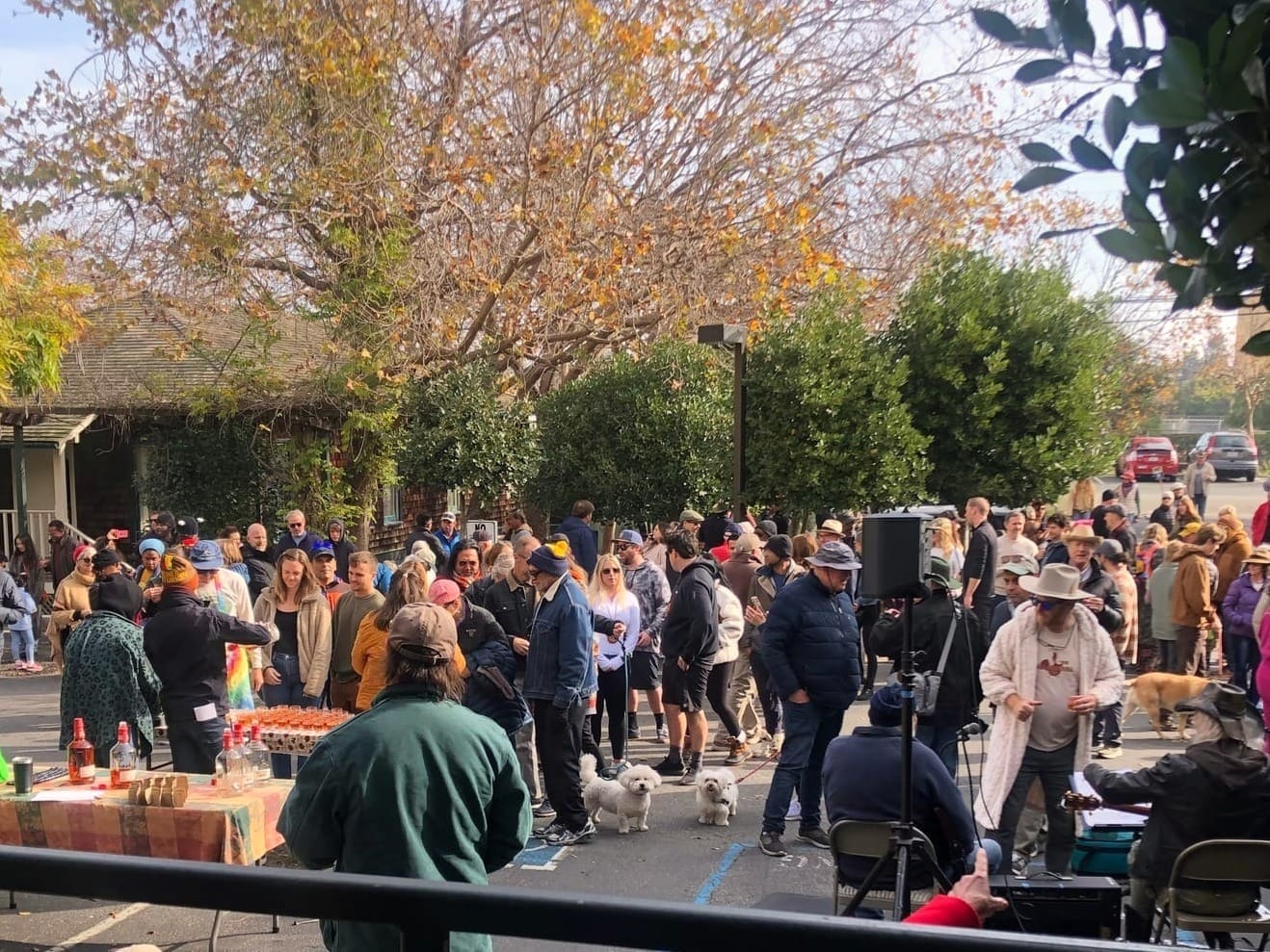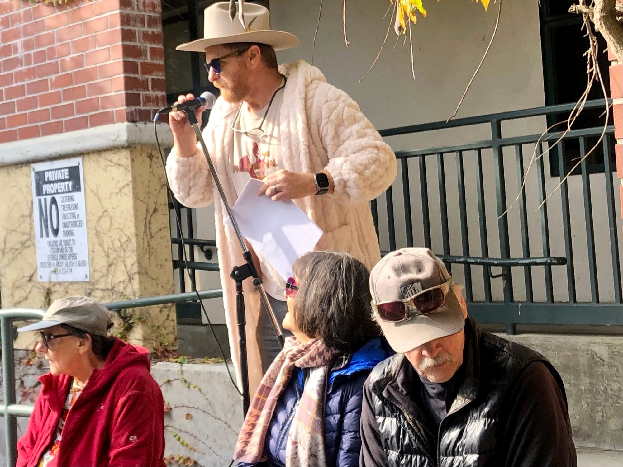 Crowd comes out for Point Richmond's annual Turkey Shoot and is greeted by this year's Master of Ceremonies, Andrew Butt.