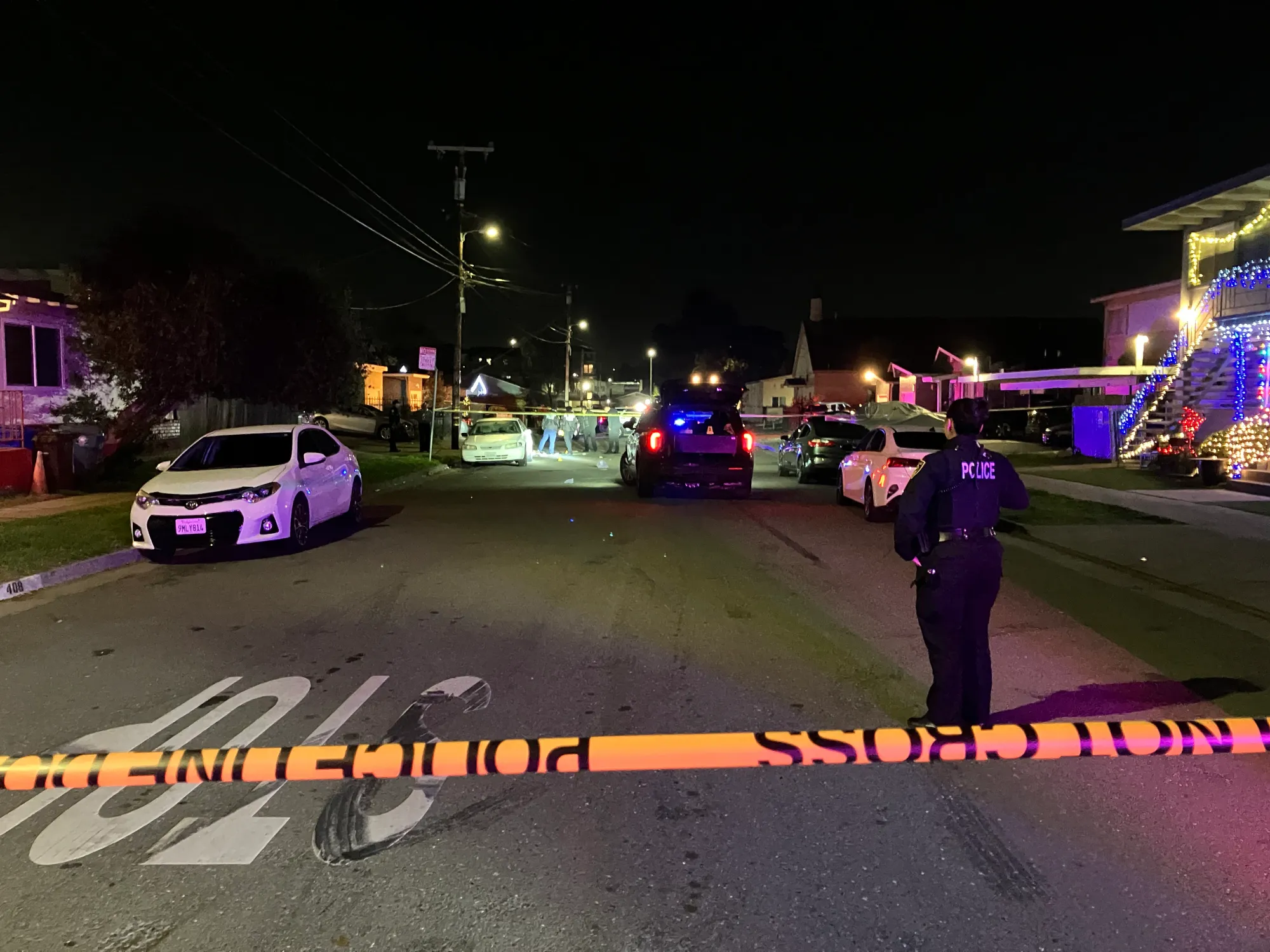 Police vehicles blocked the street as officers secured the scene with yellow police tape. Several investigators were seen examining evidence in the roadway, where multiple evidence markers were placed near parked vehicles. The area was lit by patrol car lights as officers worked behind the tape.