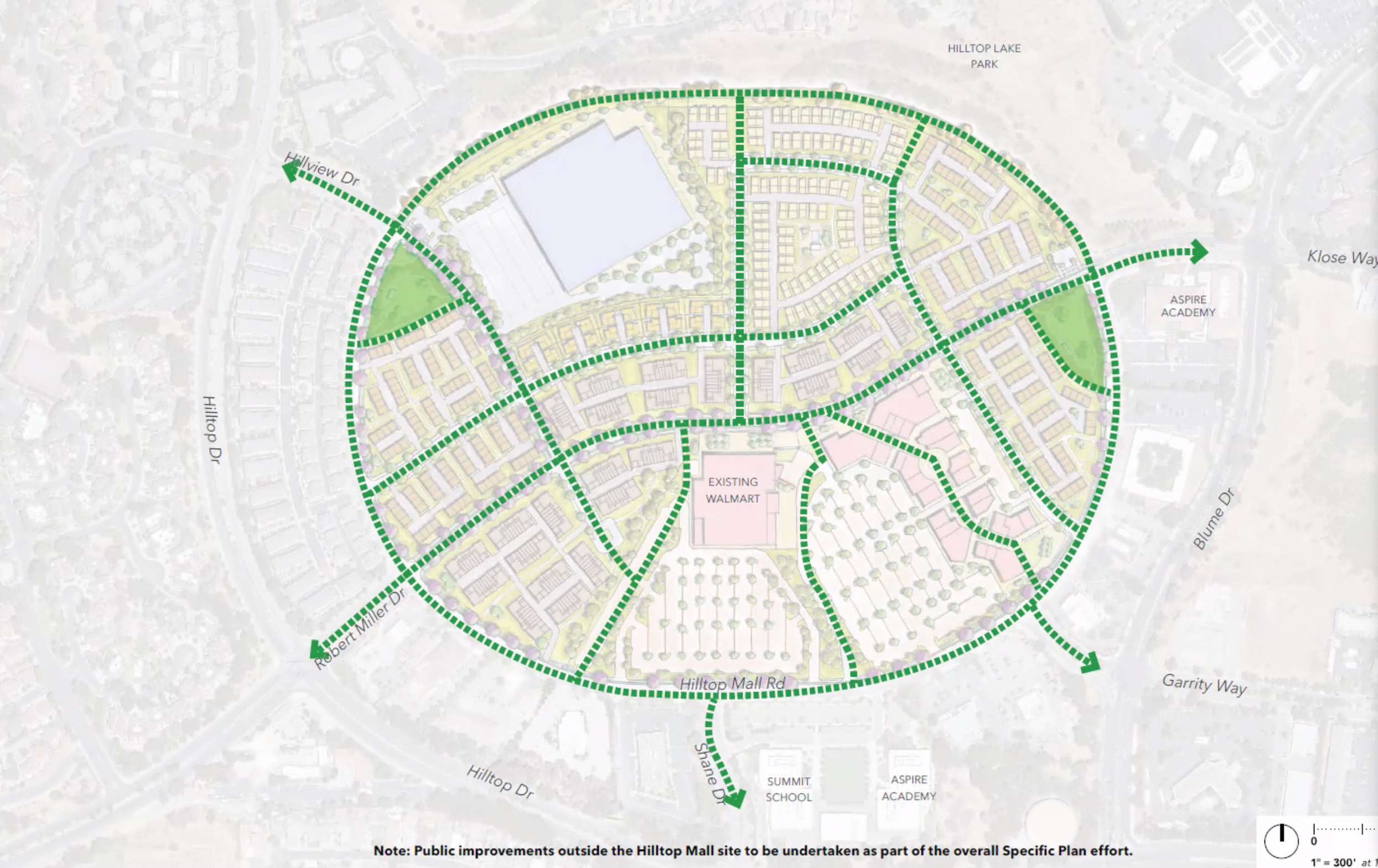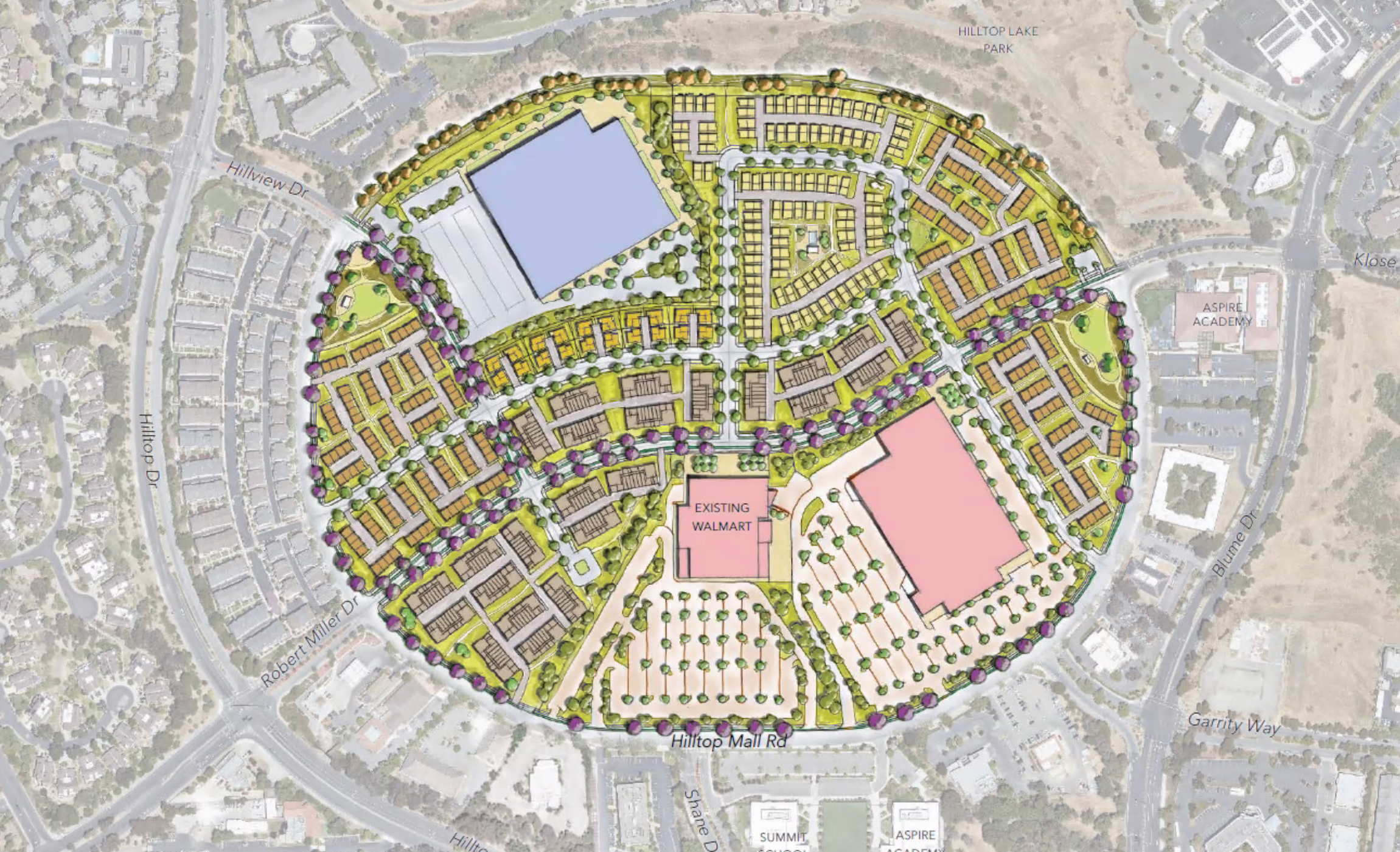Signature liked an idea to realign Hilltop Mall Road from the city’s Hilltop Horizon Specific Plan. The plan aims to transform the area from a low-intensity auto-oriented retail center to a higher-intensity, mixed-use community with housing, retail, and offices.