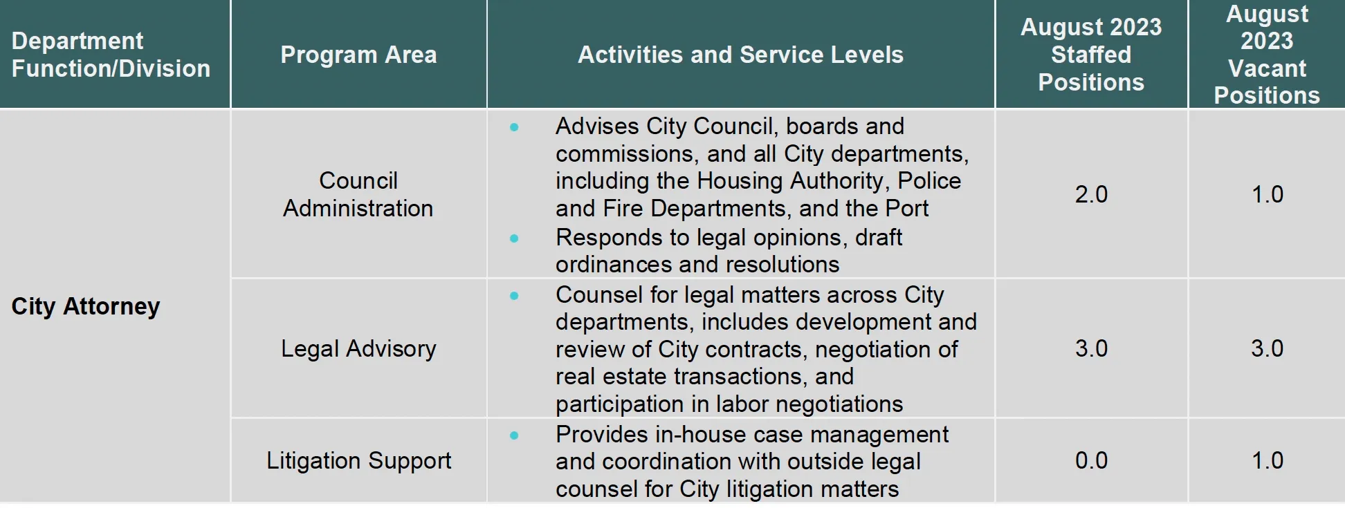 Raftelis said this understaffing and significant workload, tied to council actions and meetings three times per month, has led to delays in contract reviews and legal counsel for various city departments.