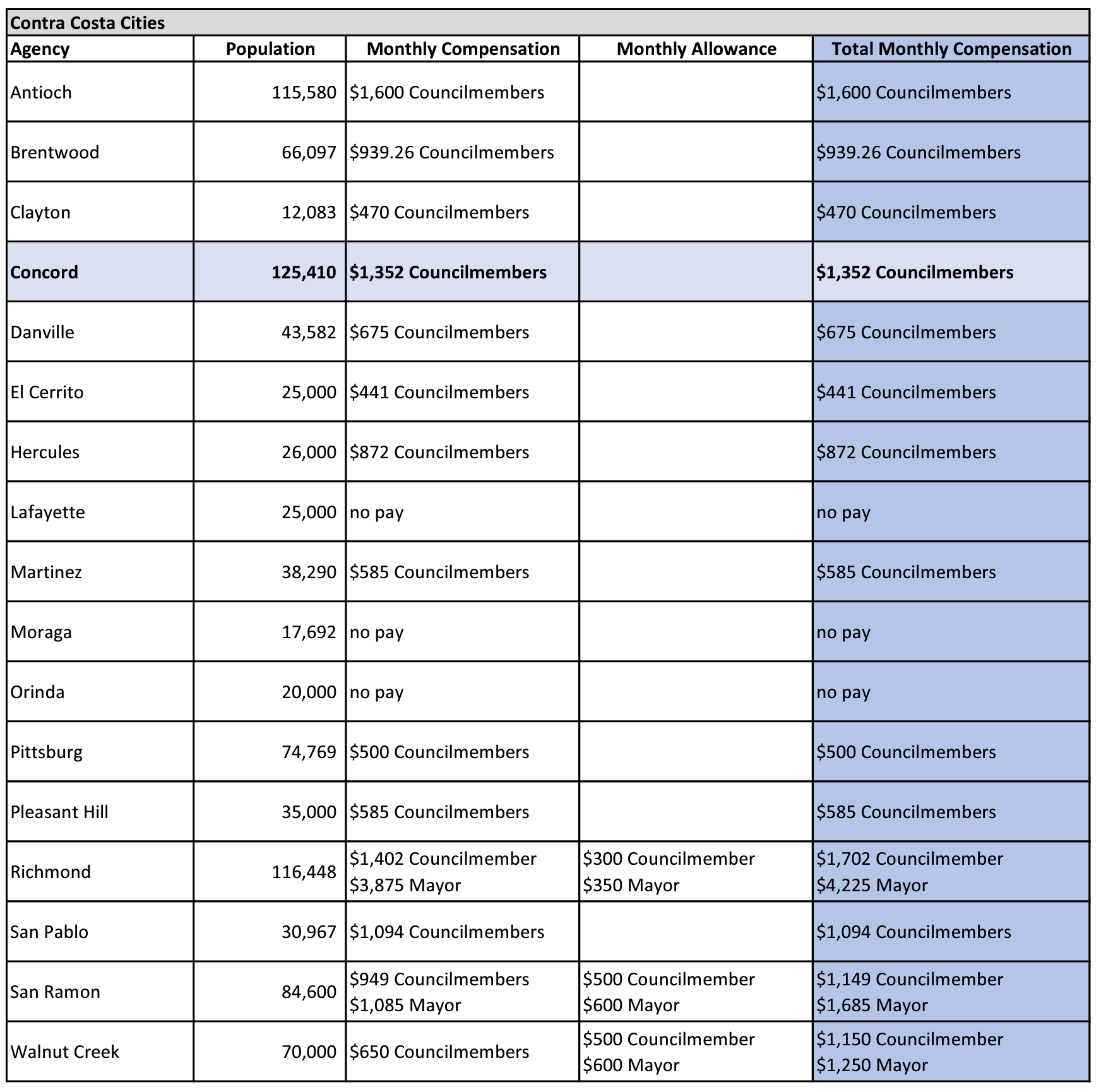 City Council pay in other Contra Costa County cities varies from no compensation in cities like Lafayette and Moraga to $1,600 per month in Antioch, the next highest compensated councilmembers behind Richmond.