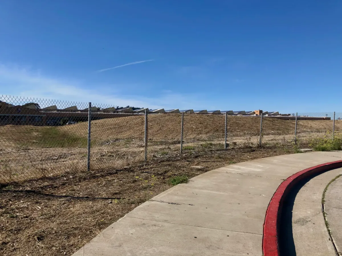 The site remains vacant with only concrete slabs and temporary fencing.
