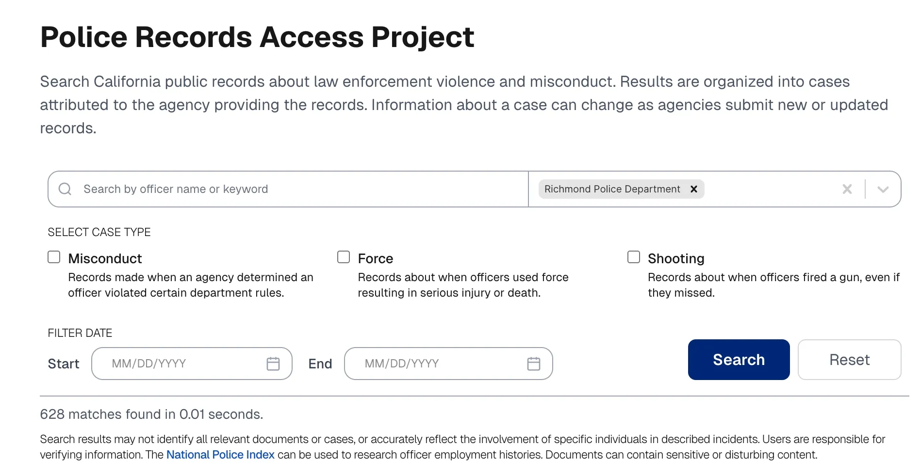Residents can search a comprehensive, publicly accessible database of internal police records documenting use of force and misconduct, including cases involving the Richmond Police Department.