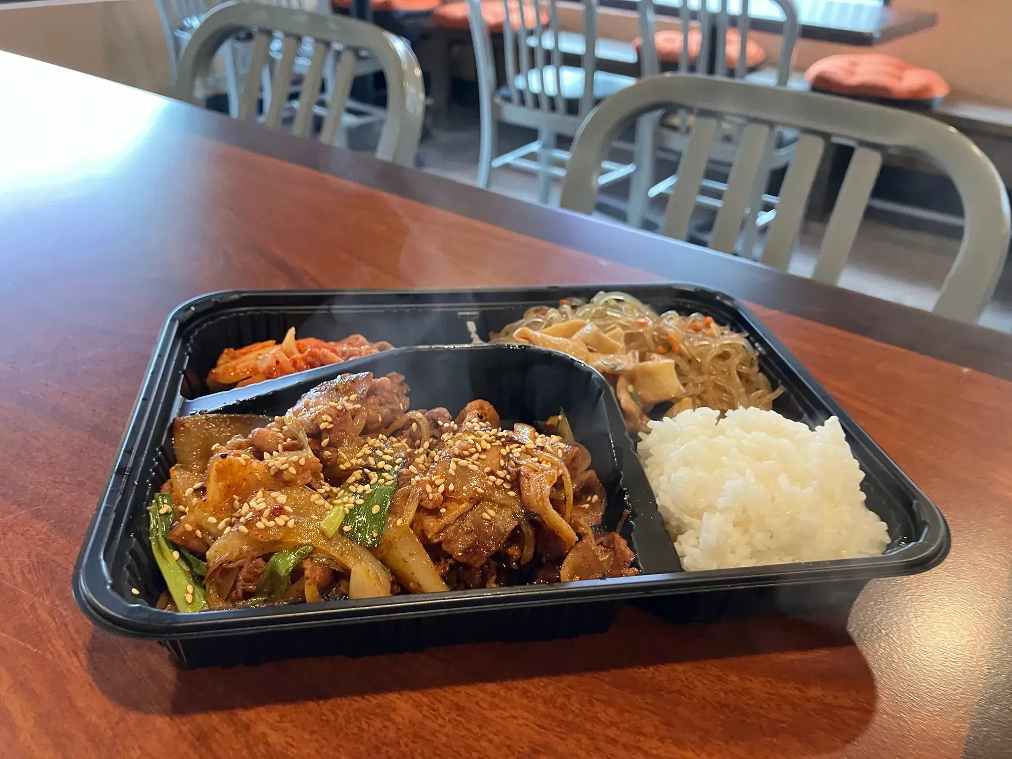 We ordered the Pork Bulgogi — which literally means "fire meat," and yeah, you can taste why. It comes with kimchi that's got that proper, vinegary tang and a gentle heat that builds rather than punches. The japchae, those translucent sweet potato starch noodles they call dangmyeon, comes tangled up with vegetables and sesame, slippery and sweet. Then there's the eomuk bokkeum, stir-fried fish cakes that hit with that specific oceanic funk.