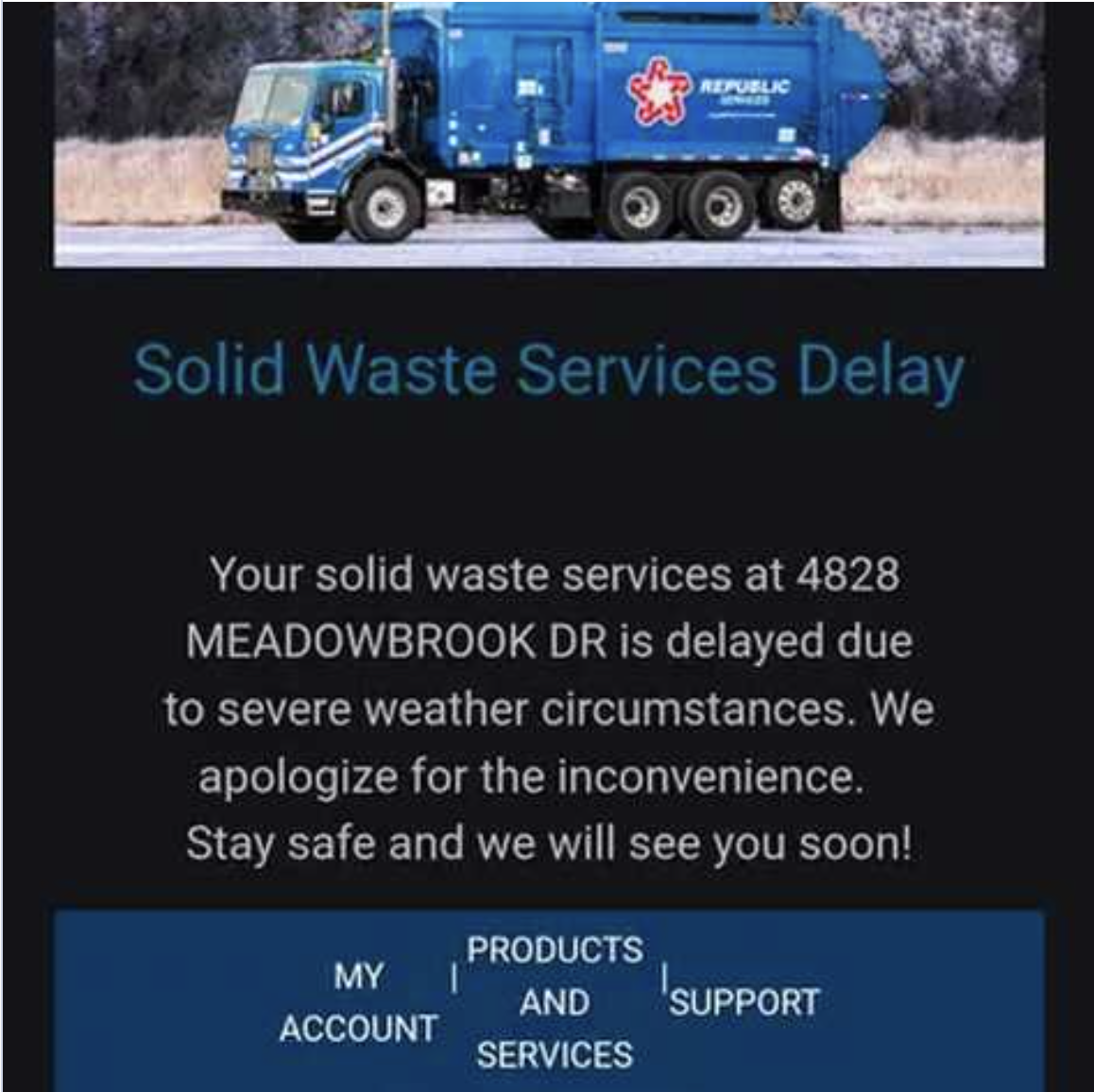 Republic Services says that it is notifying customers by phone, although comments on social media indicate many residents have received a puzzling email citing severe weather as the cause of the delay in garbage service.