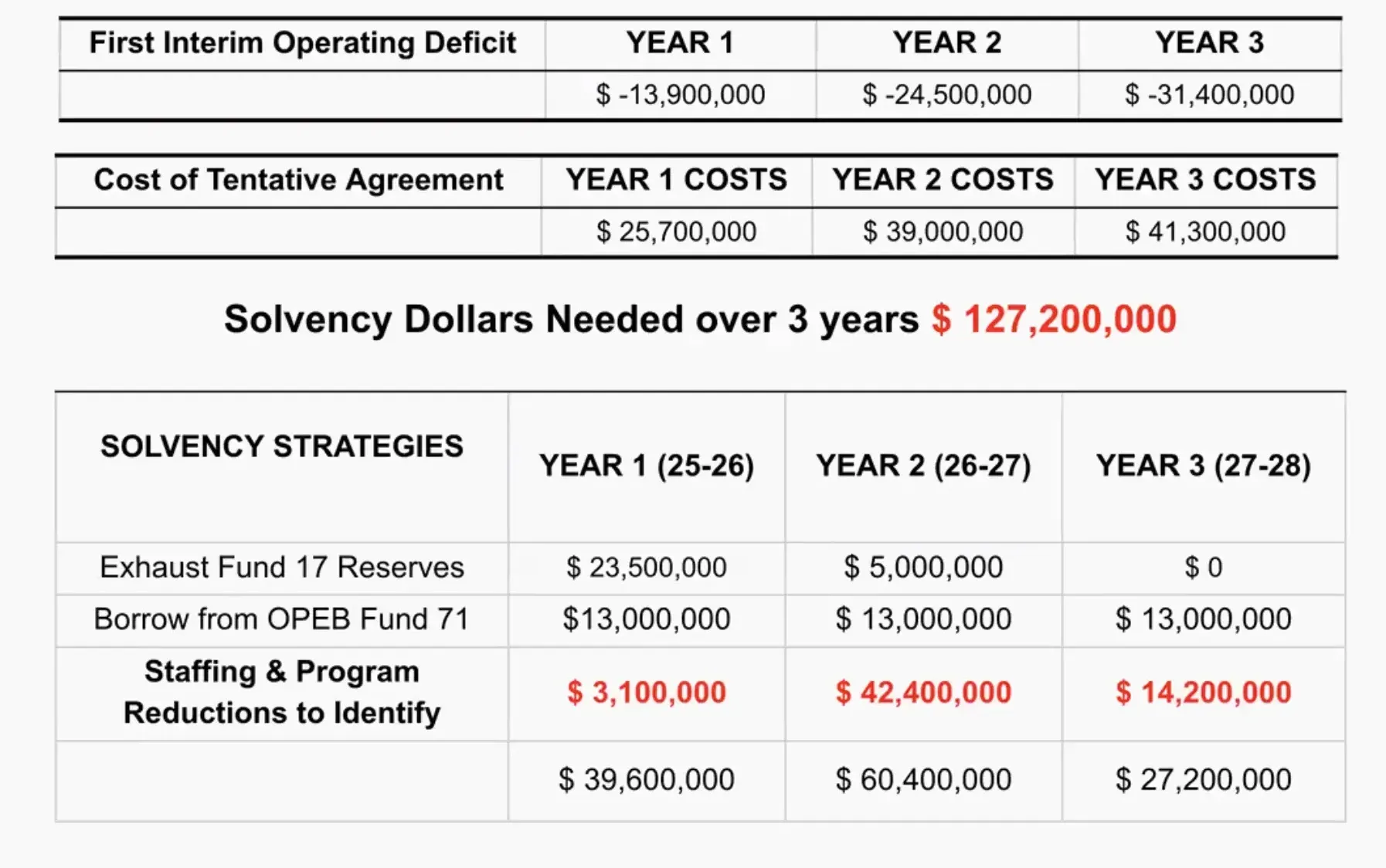 Acting Associate Superintendent of Business Services Jeff Carter said the tentative agreements will cost $25.7 million, $39 million, and $41 million over the next three years across all unions for salary increases, health benefits and other negotiated items. Combined with the district’s existing operating deficit, the total reaches $127 million.