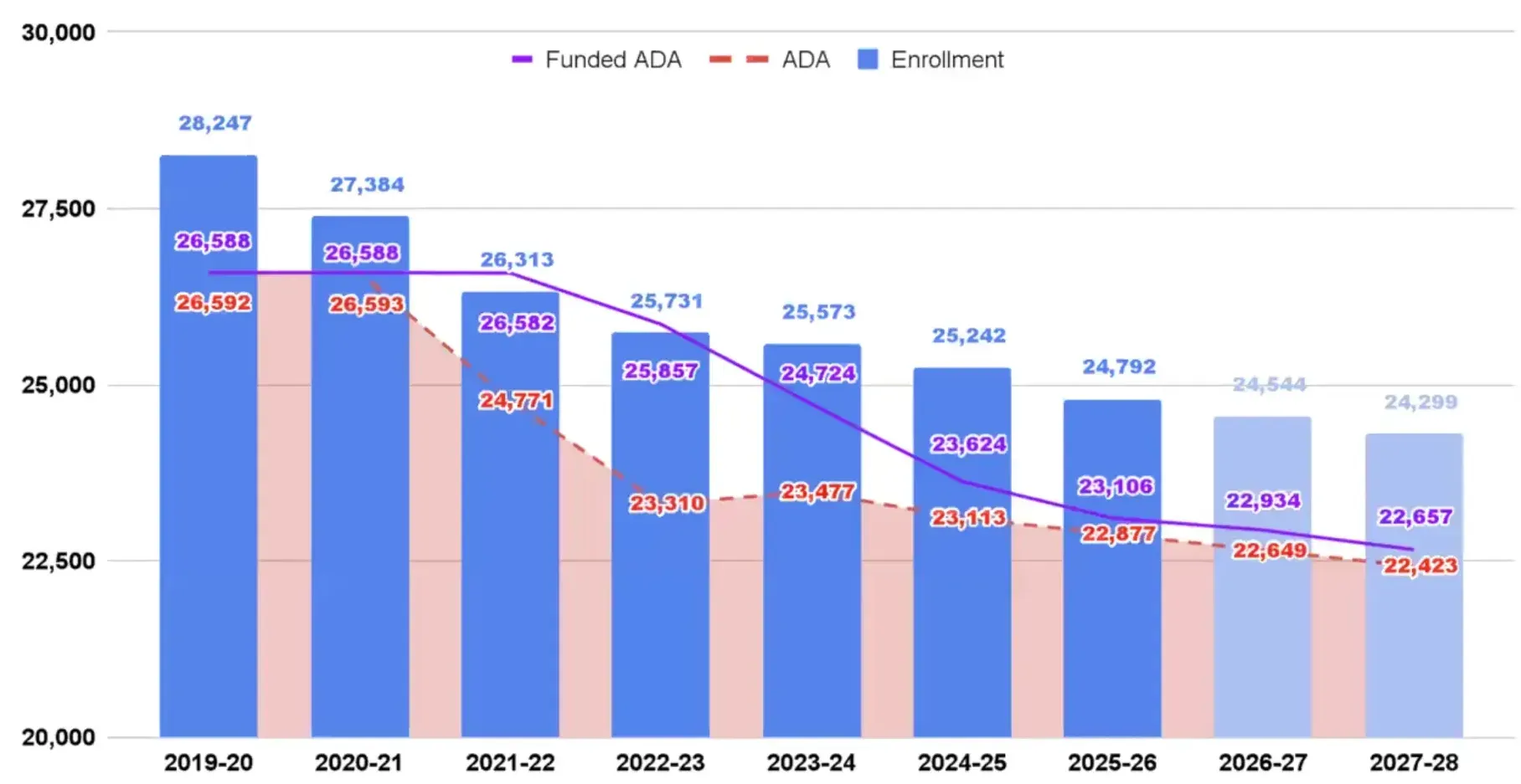The deficit stems from multiple factors, including declining enrollment and a structural budget imbalance that existed before the strike. District enrollment has dropped from 28,247 students in 2019-20 to a projected 24,792 students this year, according to district data presented at the meeting.